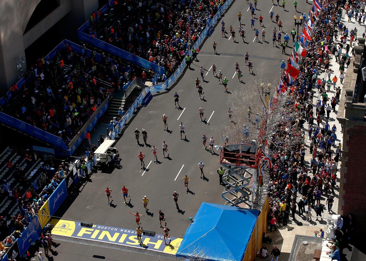 [Pictured: Boston Marathon runners cross the finish line on Boylston Street, in Boston, Massachusetts.]
