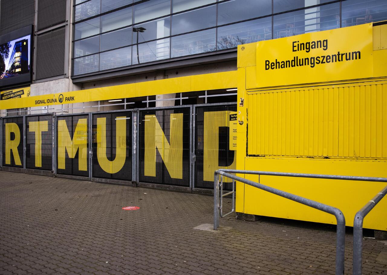 [Pictured: A sign at Signal Iduna Park marks the way to a coronavirus care facility at the north stand on April 3, 2020, in Dortmund, Germany.]