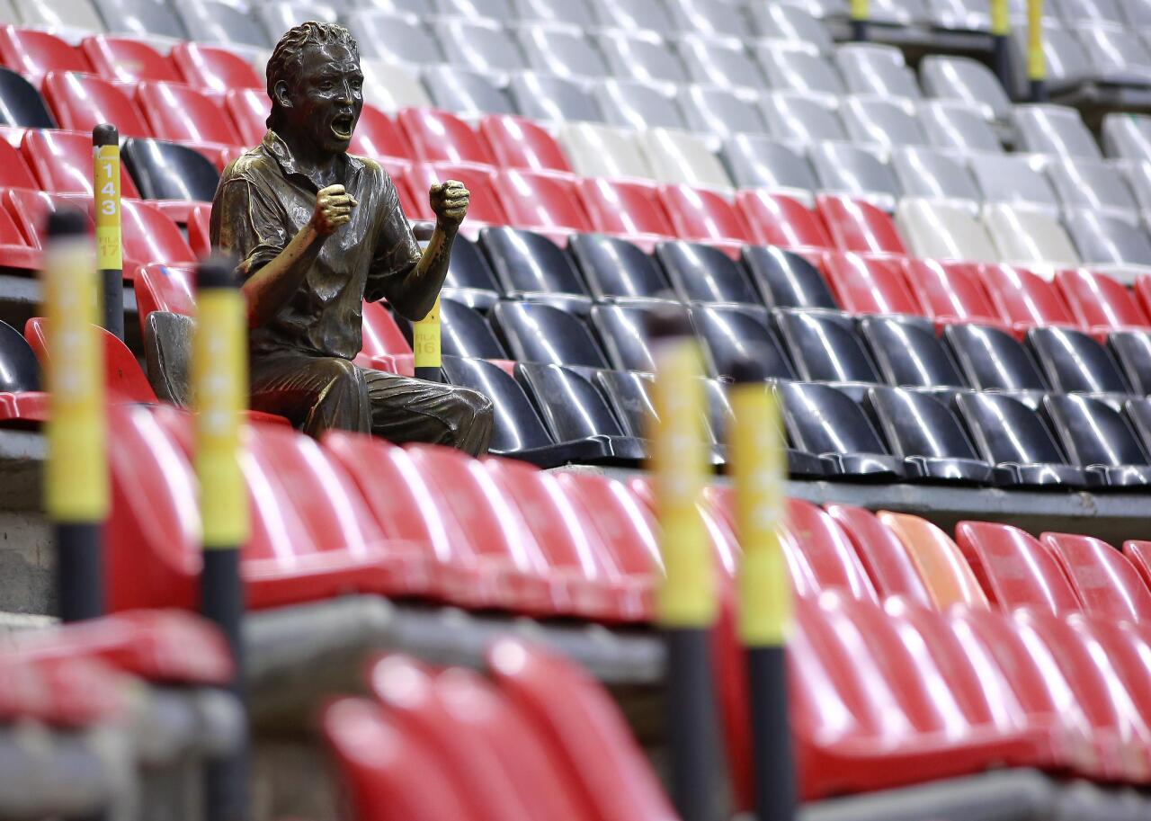 [Pictured: A sculpture among empty seats prior to the Liga MX match between America and Cruz Azul on March 15, 2020, in Mexico City.]