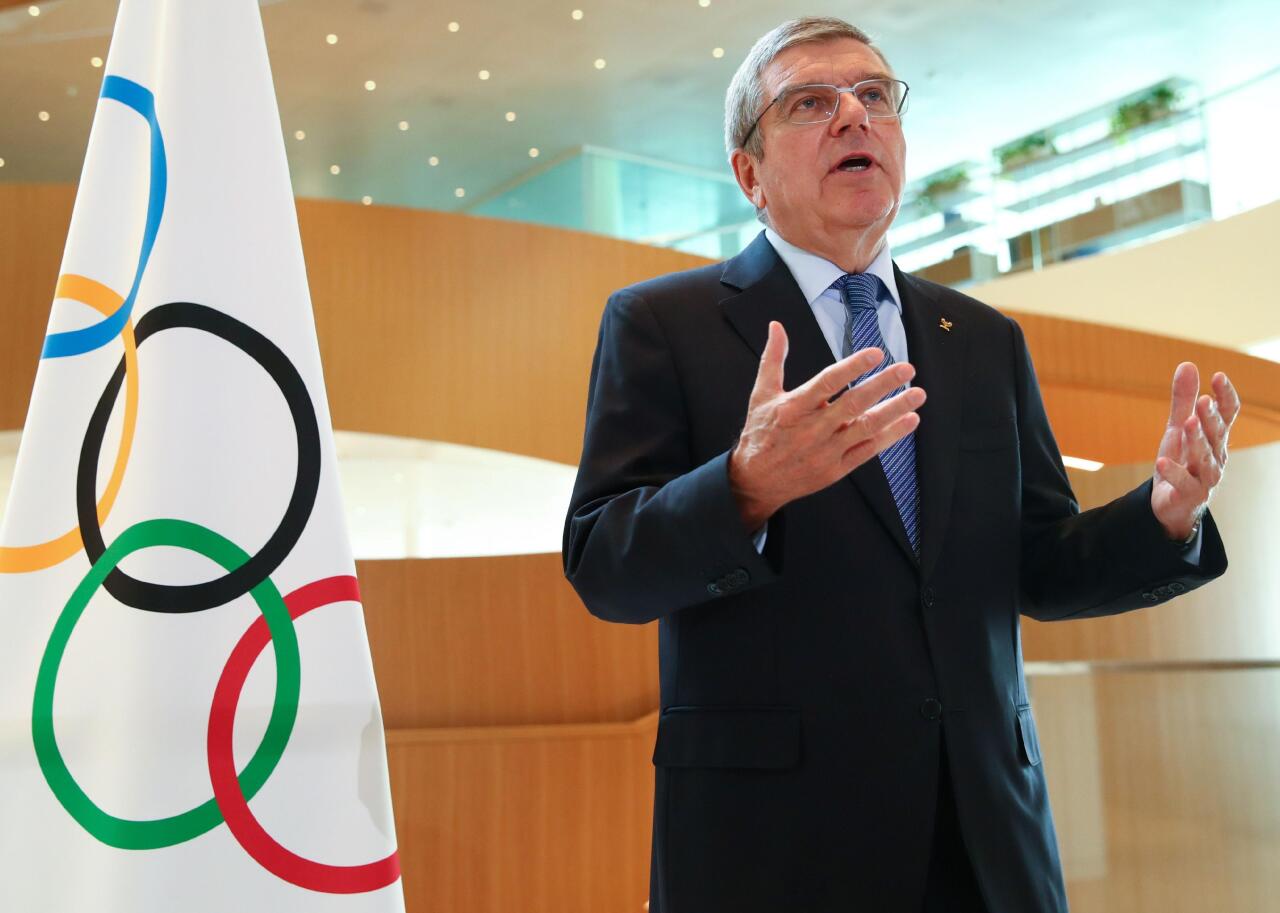 [Pictured: International Olympic Committee president, Thomas Bach, speaks during an interview after the historic decision to postpone the 2020 Tokyo Olympic Games, in Lausanne, Switzerland, on March 25, 2020.]