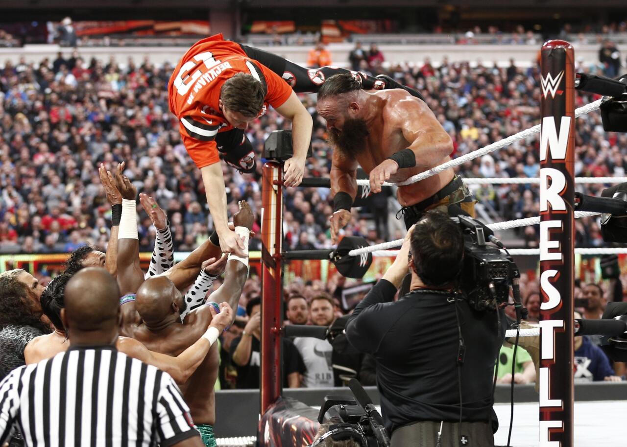[Pictured: Braun Strowman tosses Colin Jost of “SNL” out of the ring during a WWE WrestleMania at MetLife Stadium on April 7, 2019, in East Rutherford, New Jersey. ]