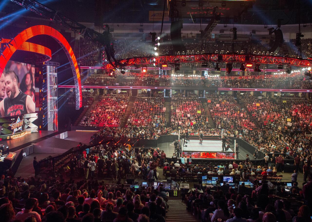 [Pictured: Thousands pack the Honda Center on Monday, Aug. 8, 2016, to watch the WWE Monday Night Raw live broadcast.]
