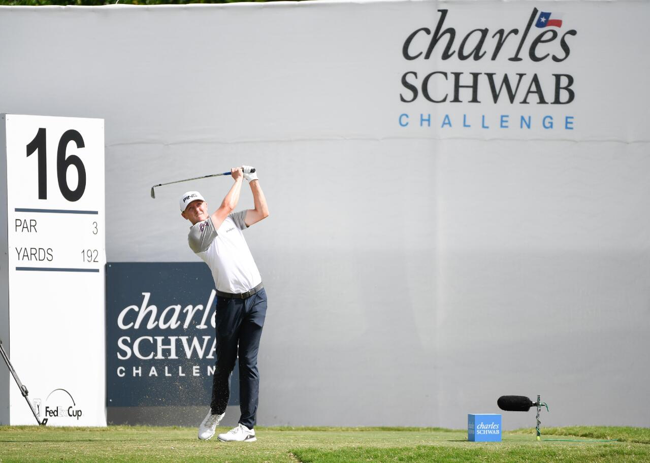 [Pictured: Mackenzie Hughes of Canada hits a shot on the 16th tee during the final round of the Charles Schwab Challenge at Colonial Country Club on May 26, 2019, in Fort Worth, Texas. ]