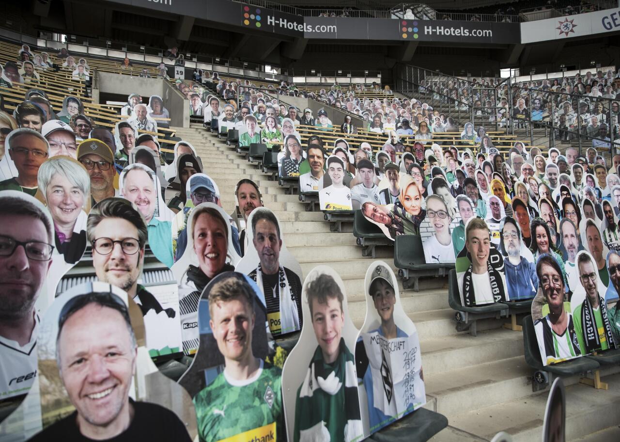 [Pictured: Borussia Mönchengladbach supporters can buy cardboard characters to be displayed at the stadium should the Bundesliga continue with matches played behind closed doors.]