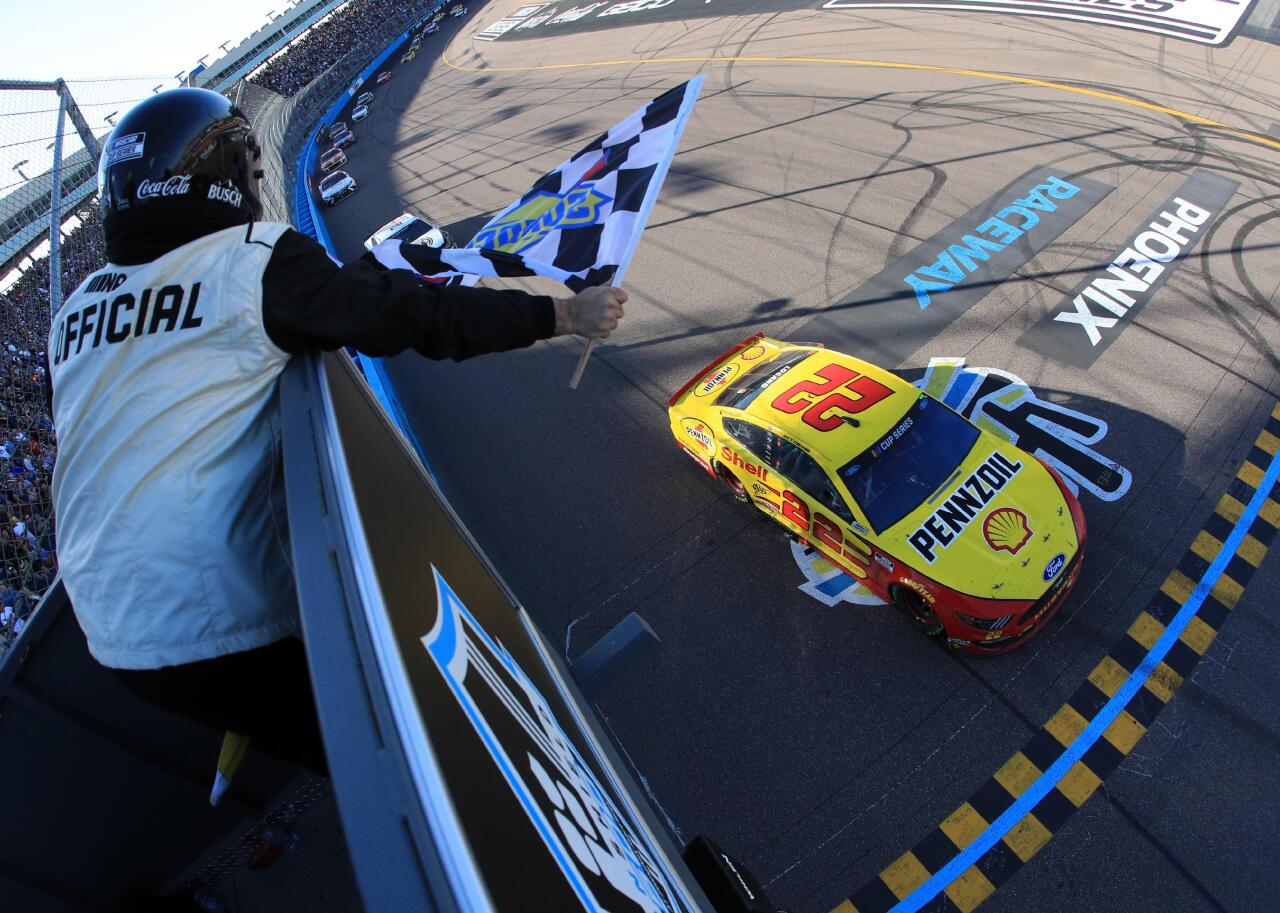[Pictured: Joey Logano crosses the finish line to win the NASCAR Cup Series FanShield 500 at Phoenix Raceway on March 8, 2020]