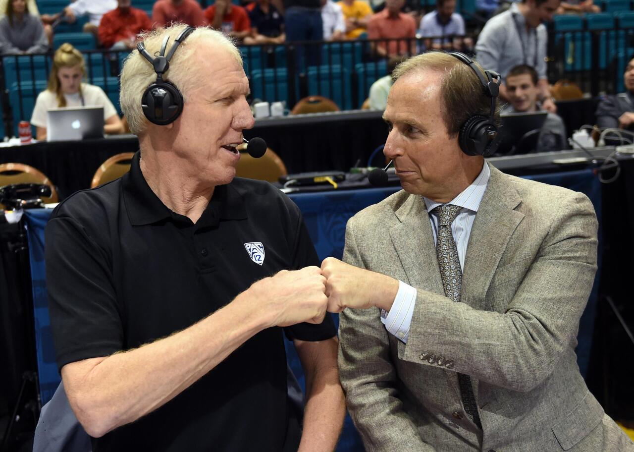 [Pictured: Bill Walton (L) and Ted Robinson talk before broadcasting a first-round game of the 2016 Pac-12 Basketball Tournament between the UCLA Bruins and the USC Trojans]