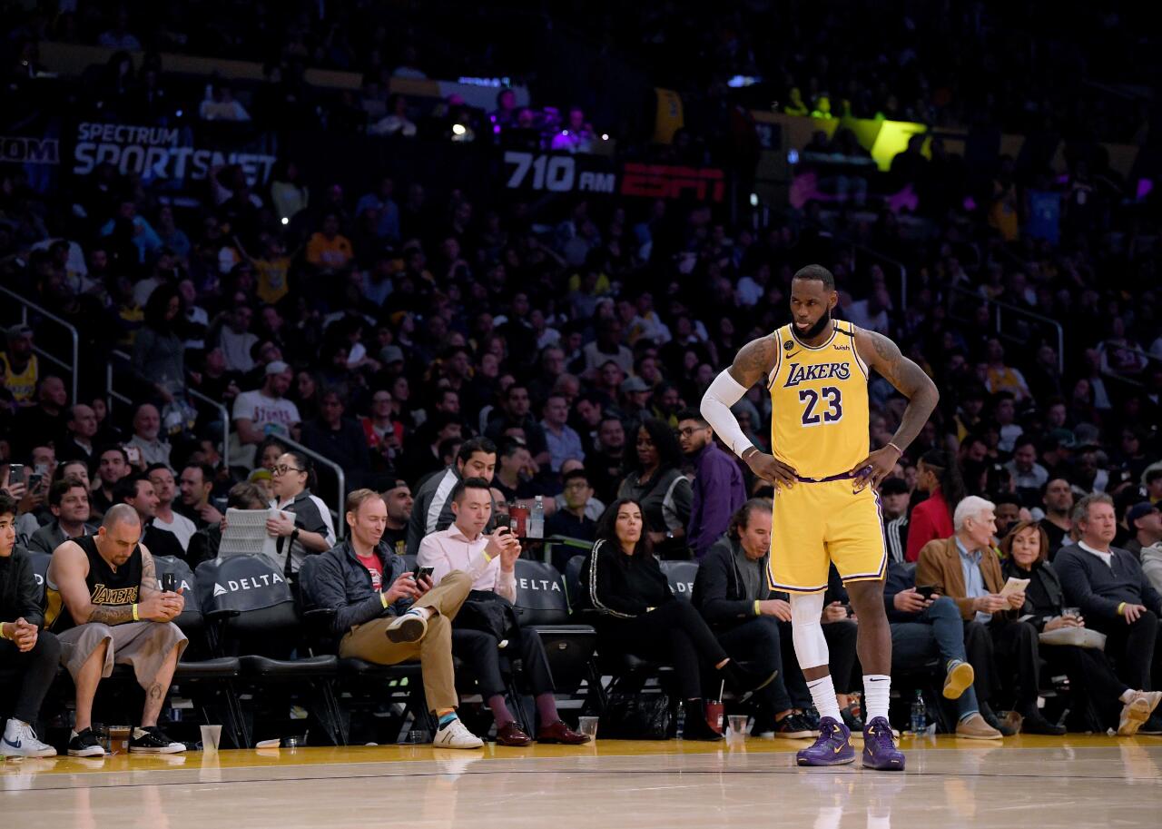 [Pictured: LeBron James stands on the court in a game against the Philadelphia 76ers at the Staples Center on March 3, 2020 in Los Angeles, California.]