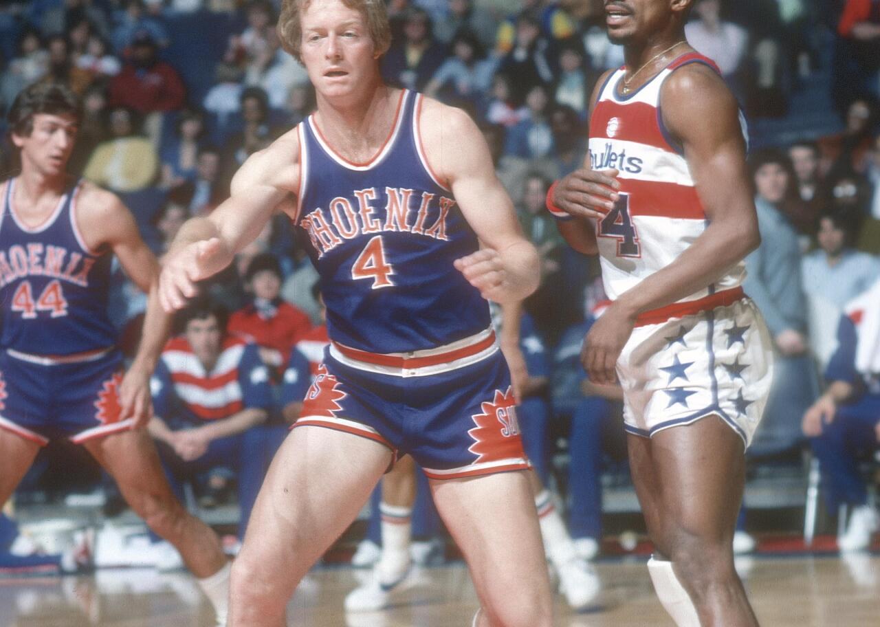 The Phoenix Suns once employed lettering somewhat like an Old English typeface, which helped accentuate the idea of the sun. During the 1976–77 season, twins Dick and Tom Van Arsdale both suited up for Phoenix.