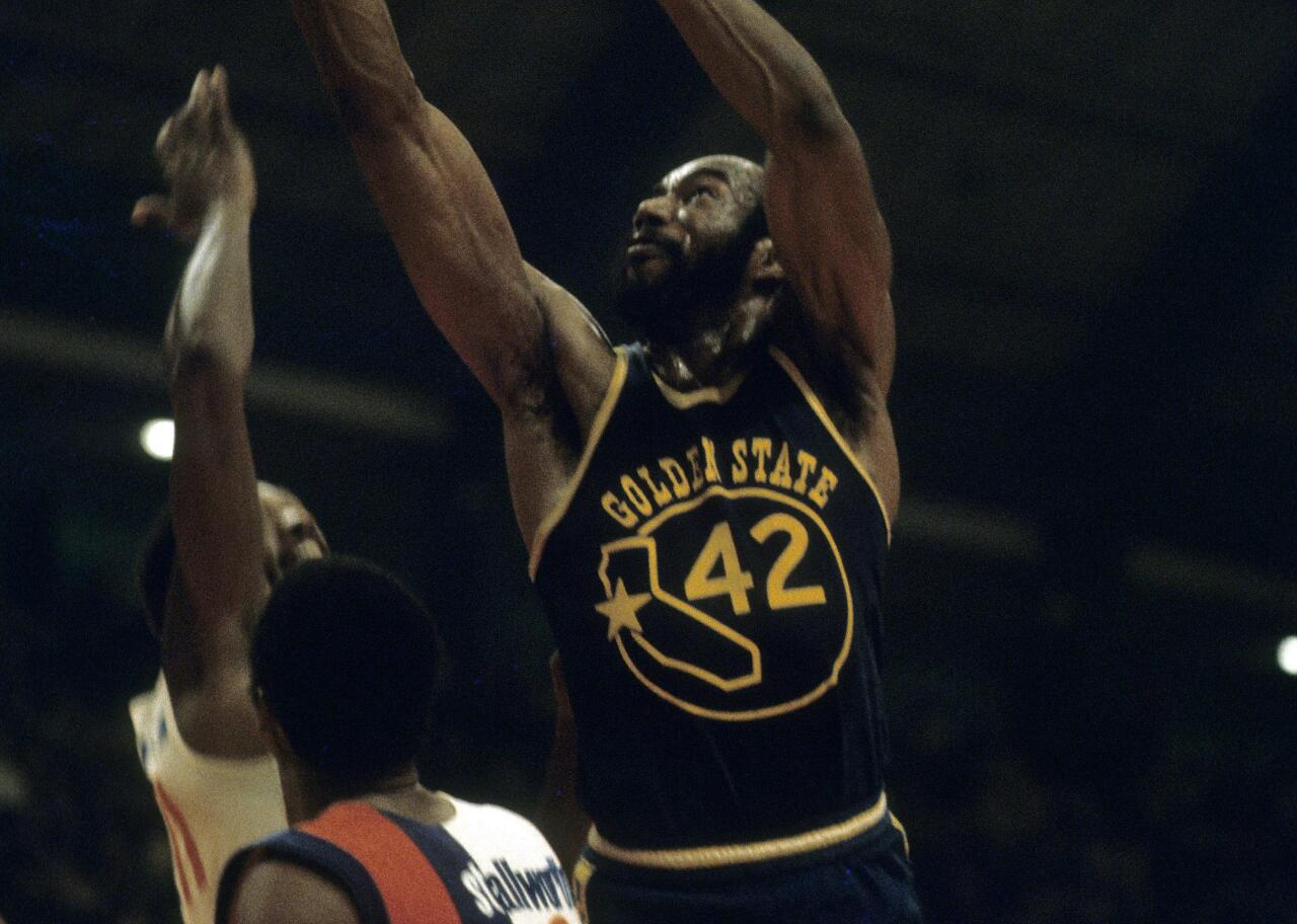 The Warriors have a series of great classic looks. The jerseys seen here feature an outline of the state of California, with a star marking the team’s location in the Bay Area. After Nate Thurmond (pictured) died in 2016, the Warriors wore a patch in his honor on their current uniforms.