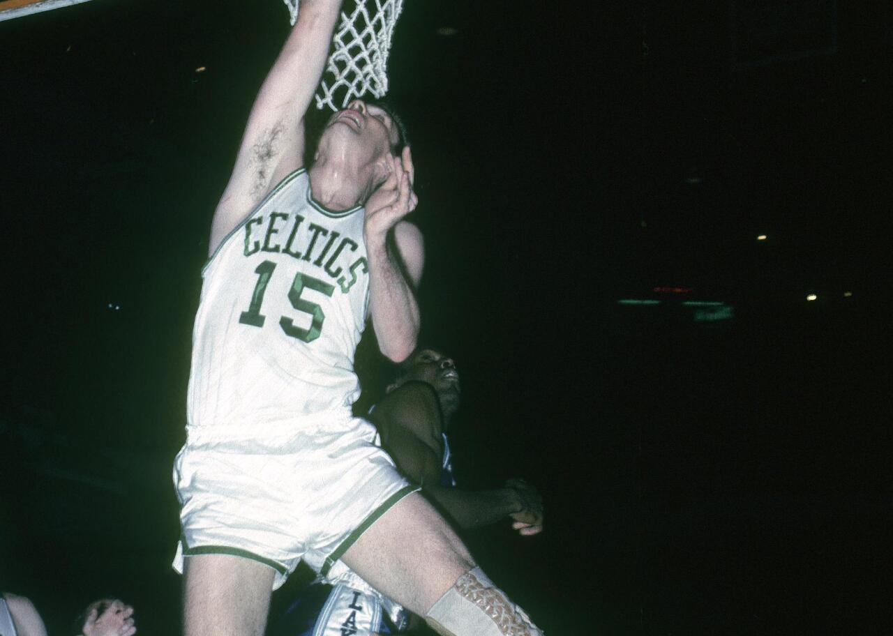 Few NBA jerseys are as recognizable as the Celtics jersey. Home white with green piping, letters, and numbers have been the standard throughout the franchise’s glory days, worn by Tommy Heinsohn (pictured), Bill Russell, Bob Cousy, Larry Bird, and several other Hall of Famers.
