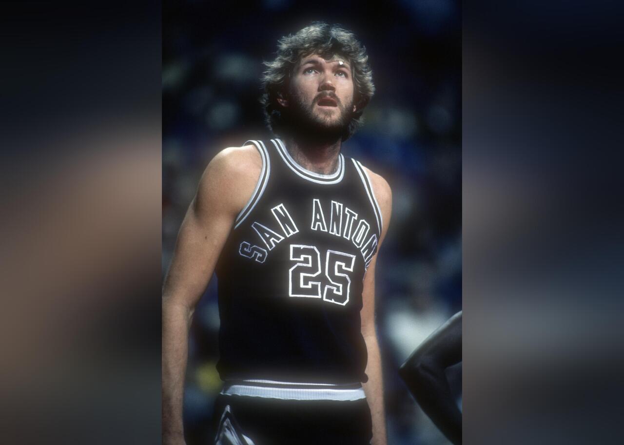 The Spurs have just about always stuck to black and white (with some silver). These jerseys, worn by George Gervin, notably feature San Antonio arched across the front, which would be discarded in future versions.
