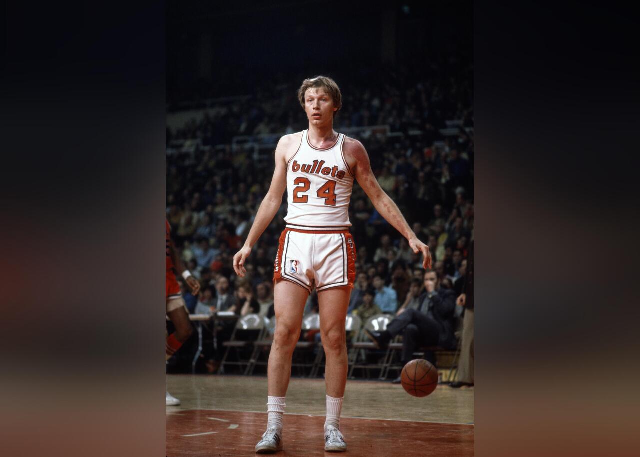 The Baltimore/Washington Bullets went with lowercase letters on the front of their jerseys, eschewing traditional style. Notice the different shape of the Ls? In later years, a ball would be added in between, to resemble a tip-off.