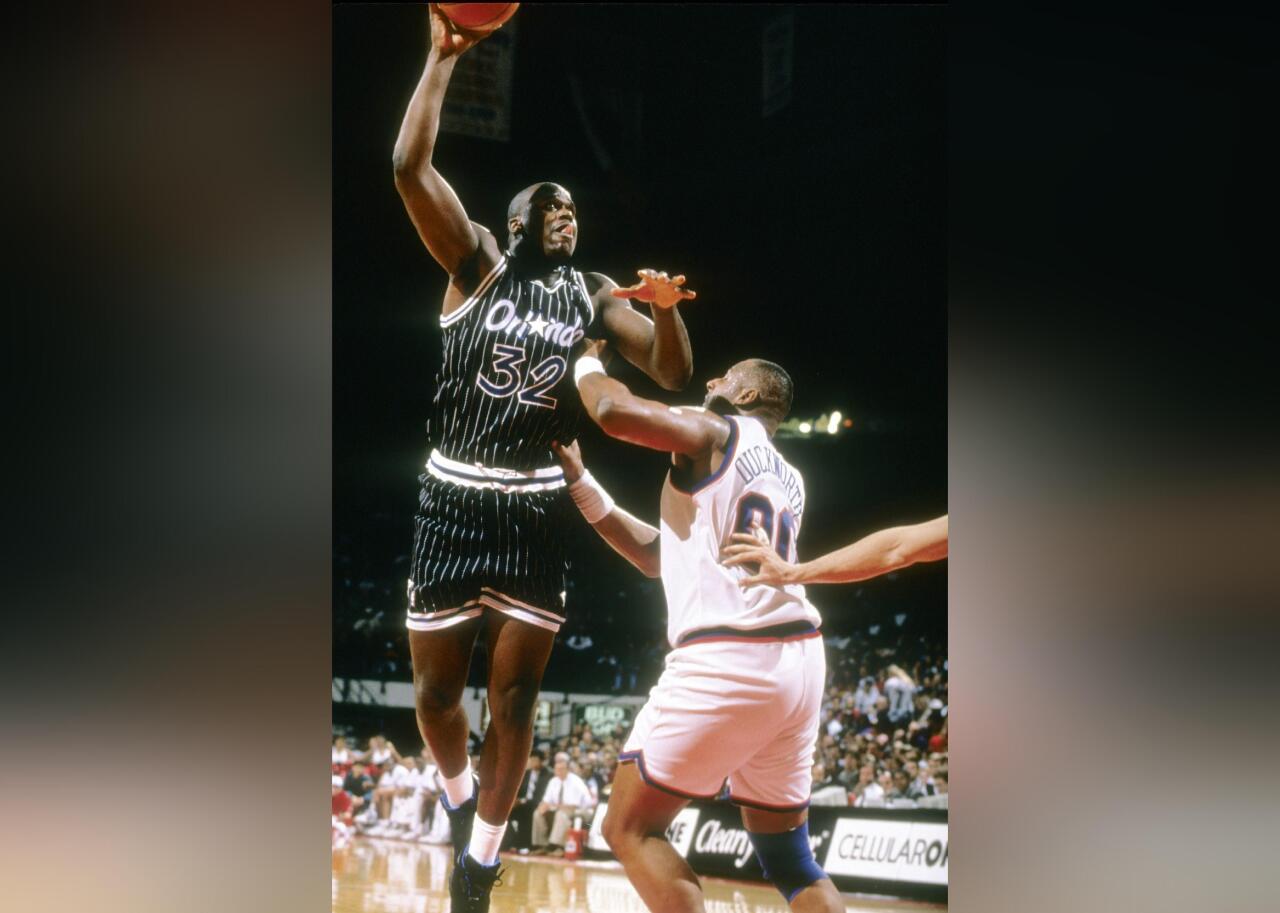 The early Magic jerseys featured pinstripes and a star replacing the “a” in Orlando. Young stars Shaquille O’Neal (pictured) and Penny Hardaway sported these unis as they carried the Magic to the NBA Finals in 1995.