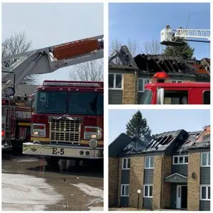 The Grand Forks Fire Department battled a south side condo fire this afternoon. Crews were notified of the blaze shortly before 12:30 p.m. When they arrived flames were visible from the roof area of Unit C of the Cherry Arms Condominiums on the 3400-3500 block of Cherry Street. Multiple trucks were utilized in extinguishing the fire at the twelve-plex building. There are no known injuries. The bulk of the structural damage appears to be to the roof area. Firefighters remain on the scene looking for hot spots. The cause is under investigation.