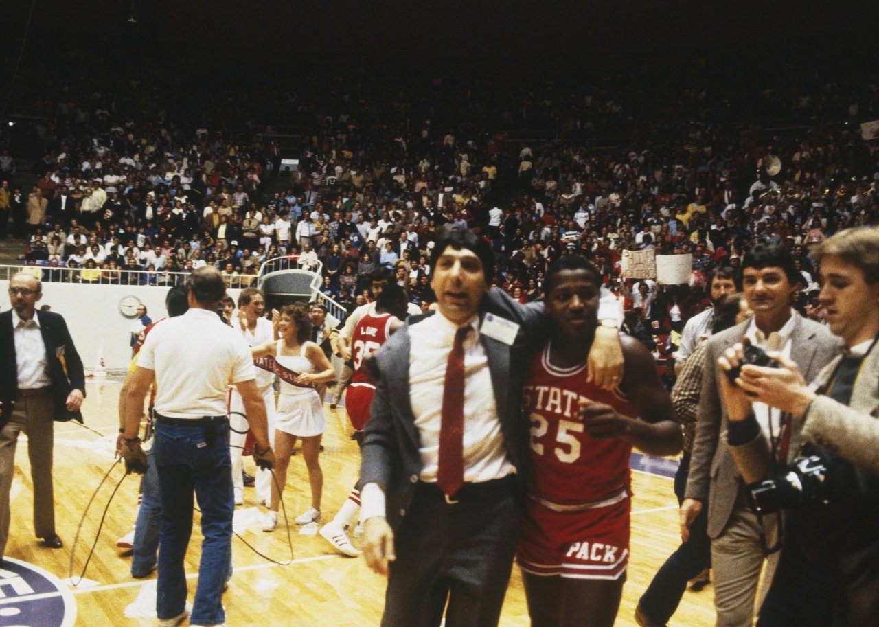 To this day, the story of the 1983 “Cardiac Pack” still evokes awe among sports fans. After putting up a respectable, if not spectacular 17–10 regular season record, the Wolfpack took the ACC Tournament title from Virginia. Led by notorious rabble-rousing coach Jim Valvano, NC State carried that momentum into a matchup with #1 seed Houston in the NCAA title game. But Houston was led by future NBA Hall of Famers Clyde Drexler and Akeem Olajuwon, and the Cougars were heavily favored to win. (The Drexel and Olajuwon duo was known as Phi Slamma Jamma for their high-scoring and dunk-filled style of play.)