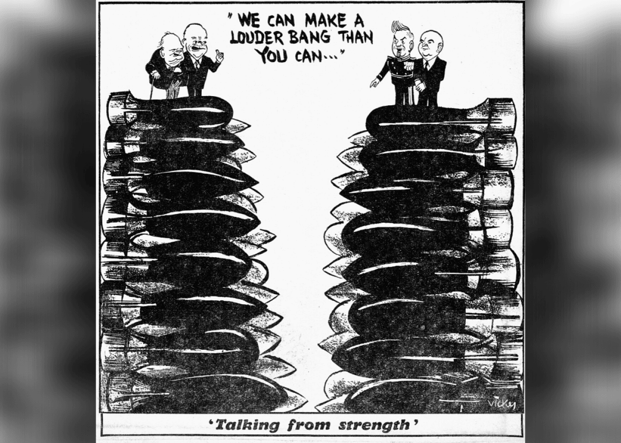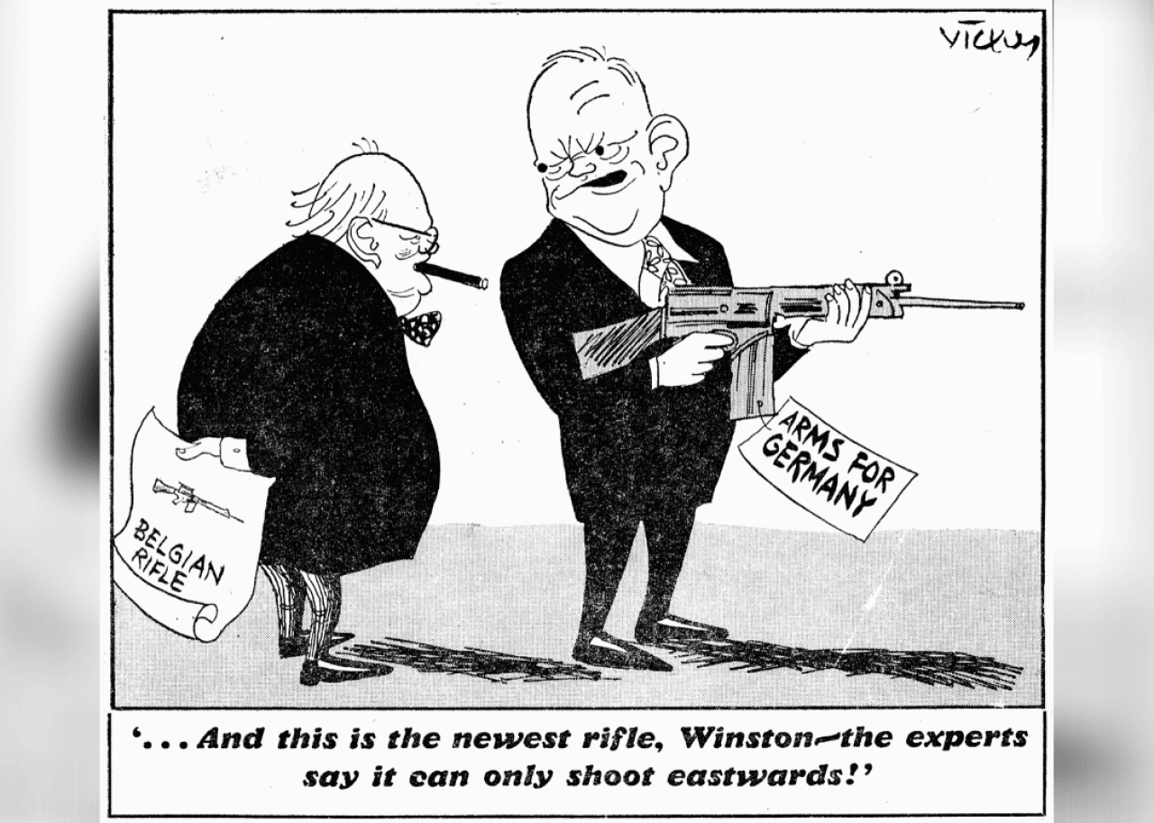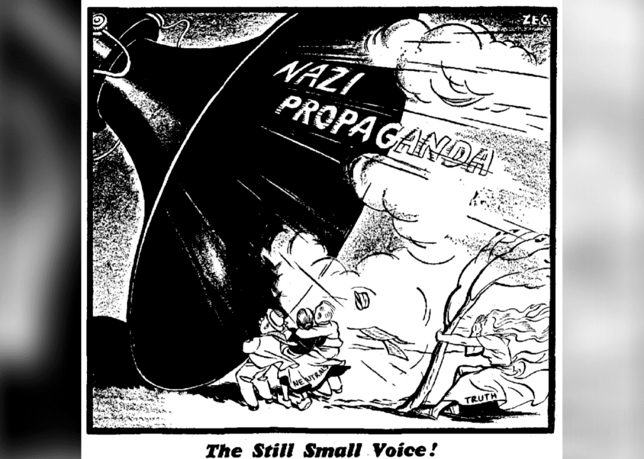 “The Still Small Voice!” depicts a bullhorn with “Nazi propaganda” blaring from it. This reflected the general sentiment towards the party, published at a time when propaganda from Germany threatened to drive a wedge between Britain and France.