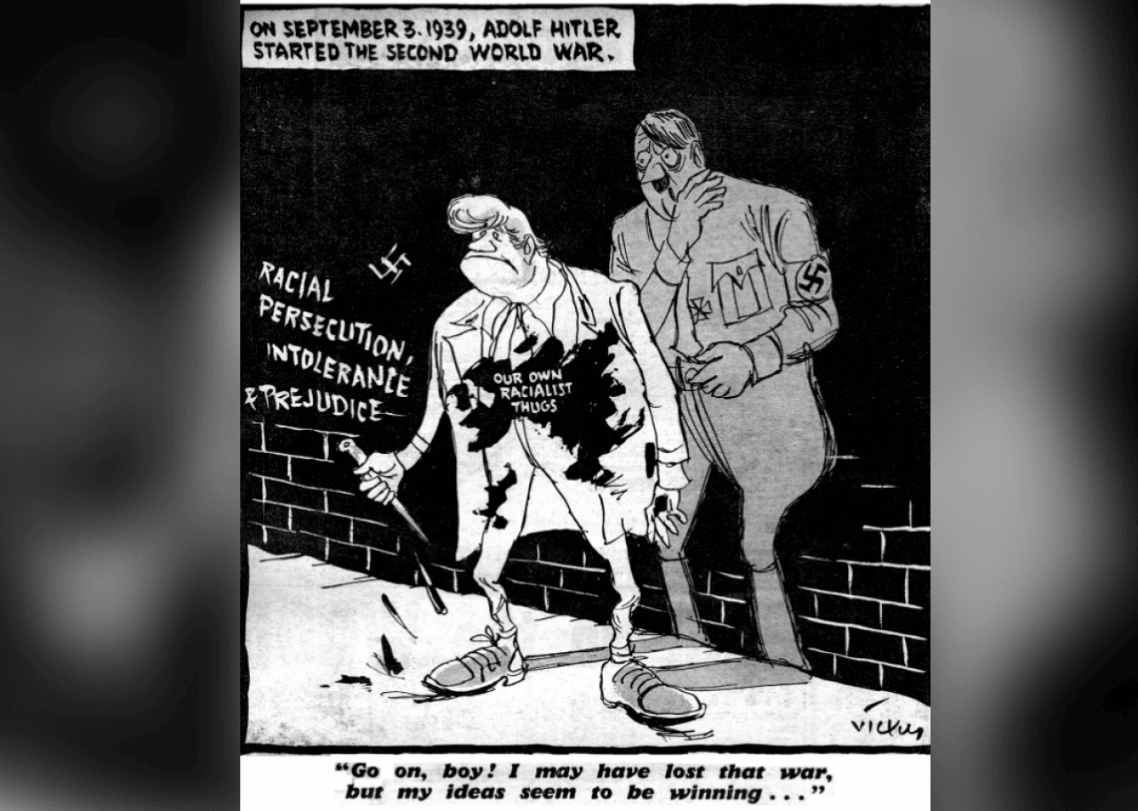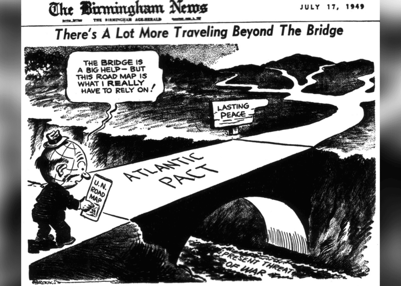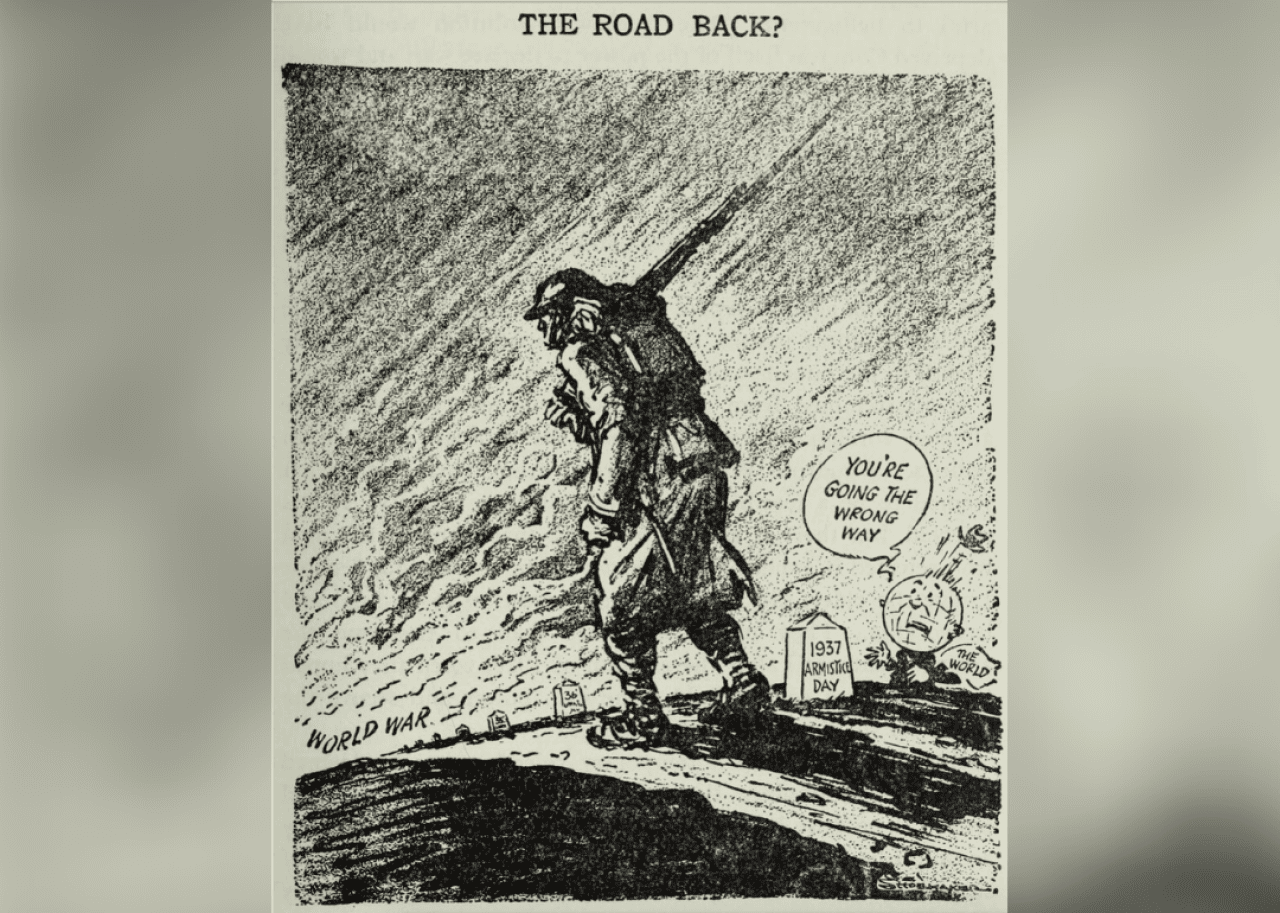 Another Pulitzer Prize winner, “The Road Back?” anticipated a second global-scale war, given a number of attacks by the Japanese. The cartoon shows the world talking a tired soldier out of conflict, while Armistice Day’s tombstone lies in the background.