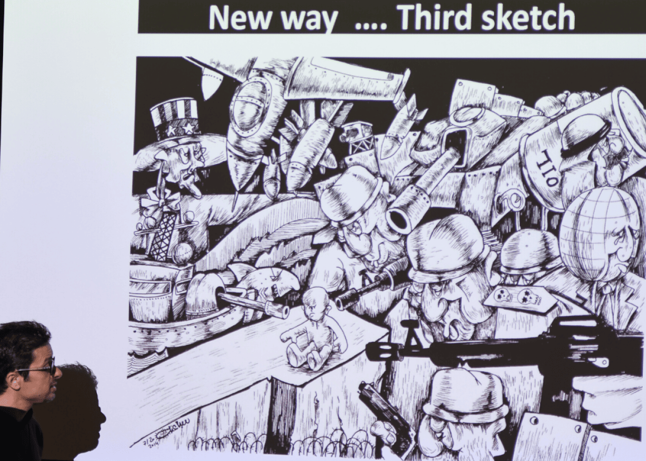 This photo shows Palestinian artist Mohammed Saba’aneh attending an Art and Resistance in Palestine event at Trinity College in Dublin, Ireland. The event was organized by a local branch of the Boycott, Divestment, Sanctions (BDS) movement, which aims to end the Israeli occupation of the West Bank.