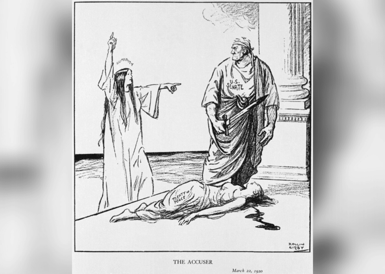 “The Accuser” shows a woman reprimanding the U.S. Senate for killing what’s lying on the ground: “The treaty of peace.” This referred to the Treaty of Versailles, which brought an end to the war between the Allied Powers and Germany.