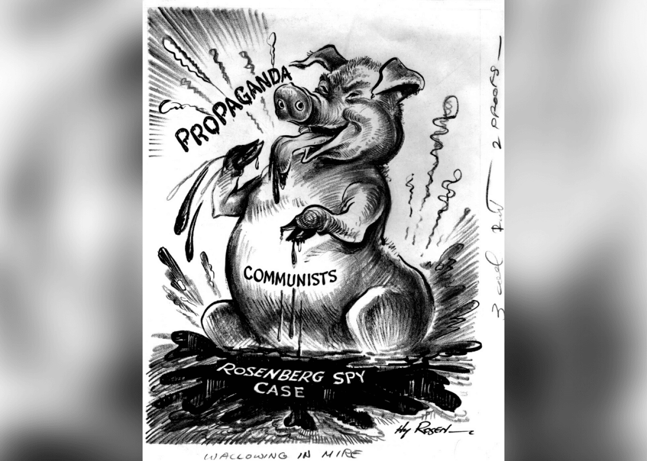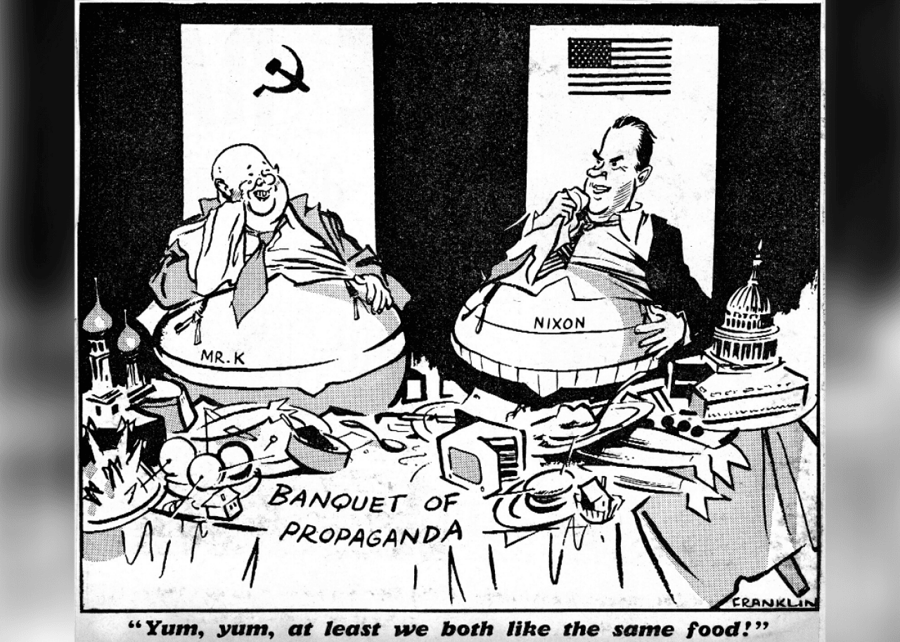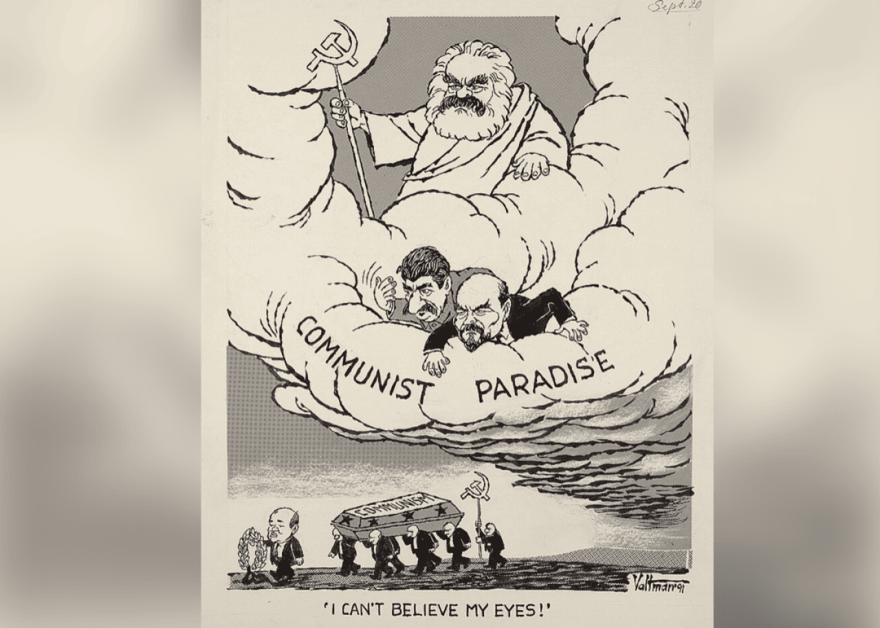 Portrayed as a body in a coffin, Communism is lamented by Vladimir Lenin, Karl Marx, and Joseph Stalin at a funeral led by Mikhail Gorbachev. The cartoon referred to Gorbachev’s foreign policy of appeasement, disarming the national Communist Party and hiring elected leaders.