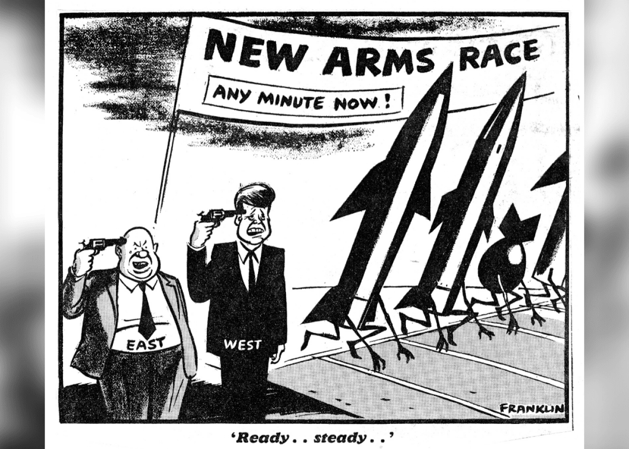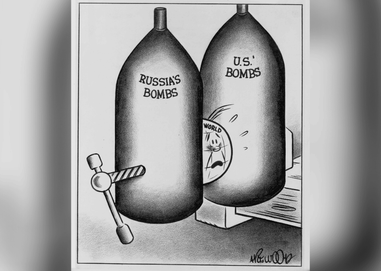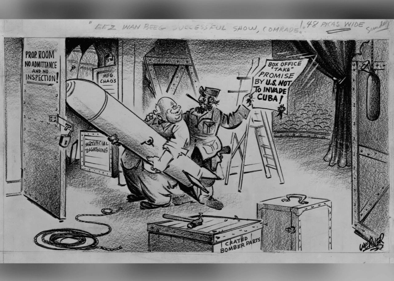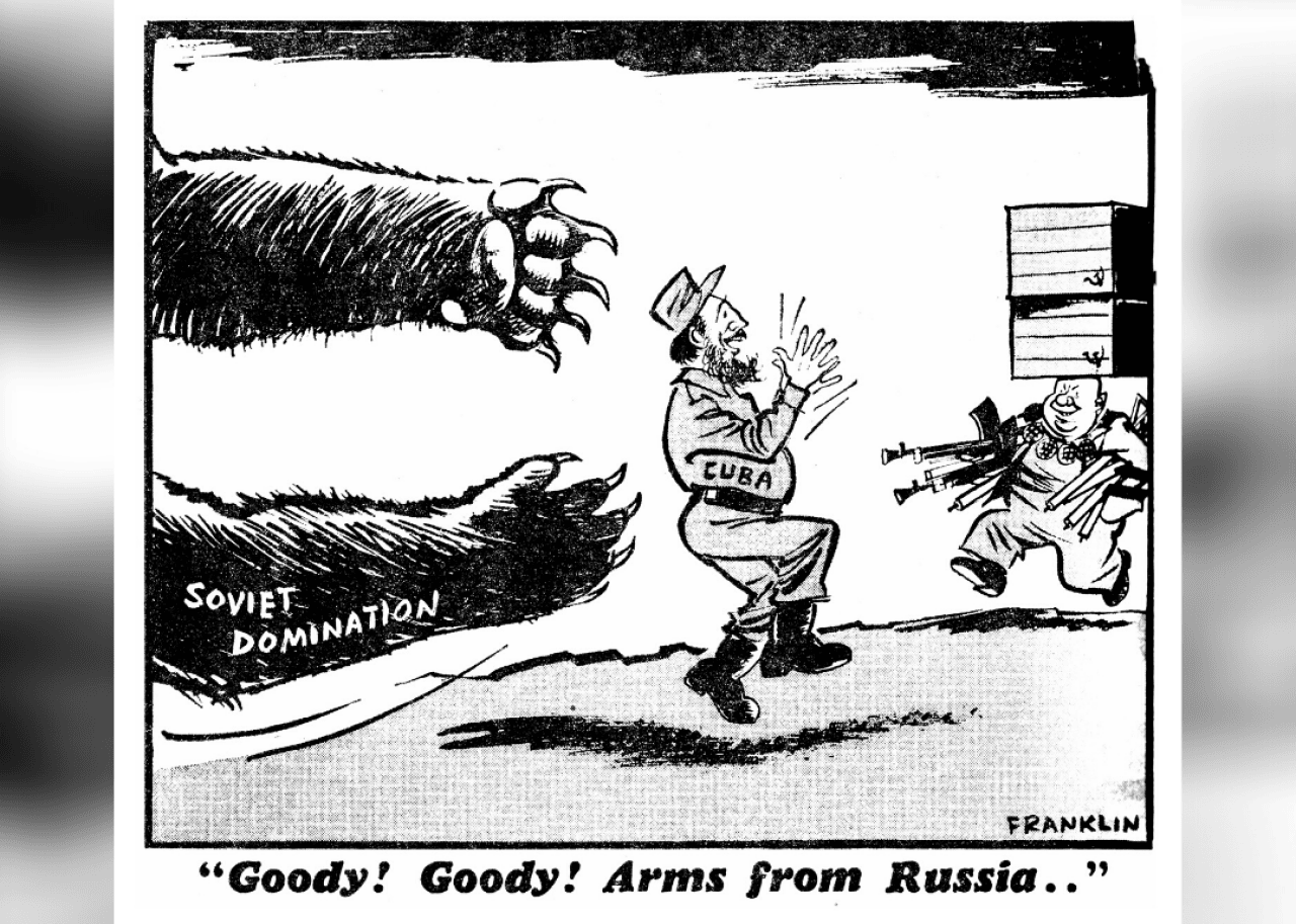 Portrayed as a body in a coffin, Communism is lamented by Vladimir Lenin, Karl Marx, and Joseph Stalin at a funeral led by Mikhail Gorbachev. The cartoon referred to Gorbachev’s foreign policy of appeasement, disarming the national Communist Party and hiring elected leaders.