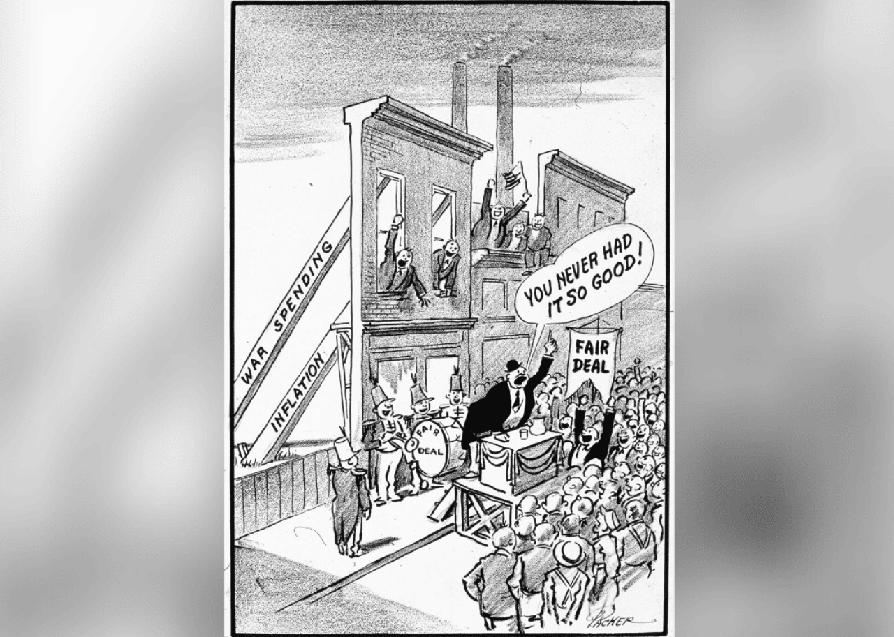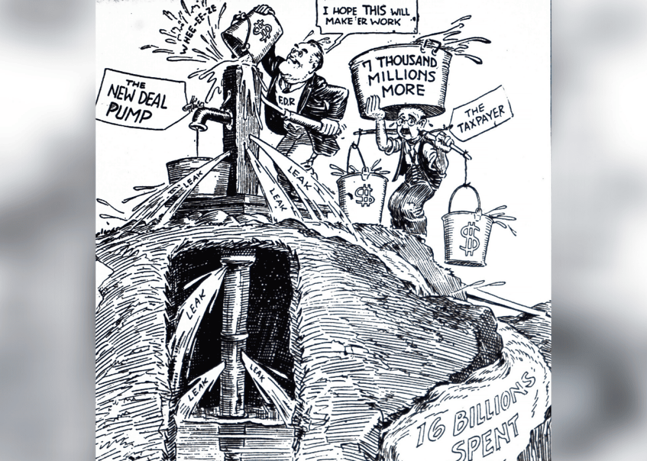 “What We Need is Another Pump” is another critique of FDR’s New Deal. The cartoon depicts FDR attempting to force money into a leaky economy.