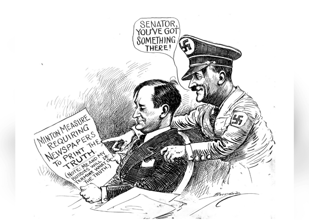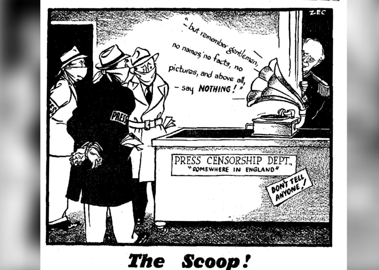 “The Scoop!” by Philip Zec depicts a group of bound and gagged journalists. The cartoon refers to the state of censorship during World War II.
