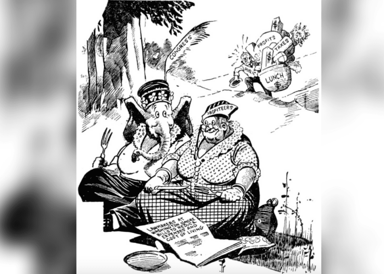 Homer Stinson stunned his readers by drawing Congress and profiteers preparing for a hearty meal, while the public is in the background carrying taxes, profits, and lunch to them. The cartoon was part of an editorial called “Where the Money Is.”