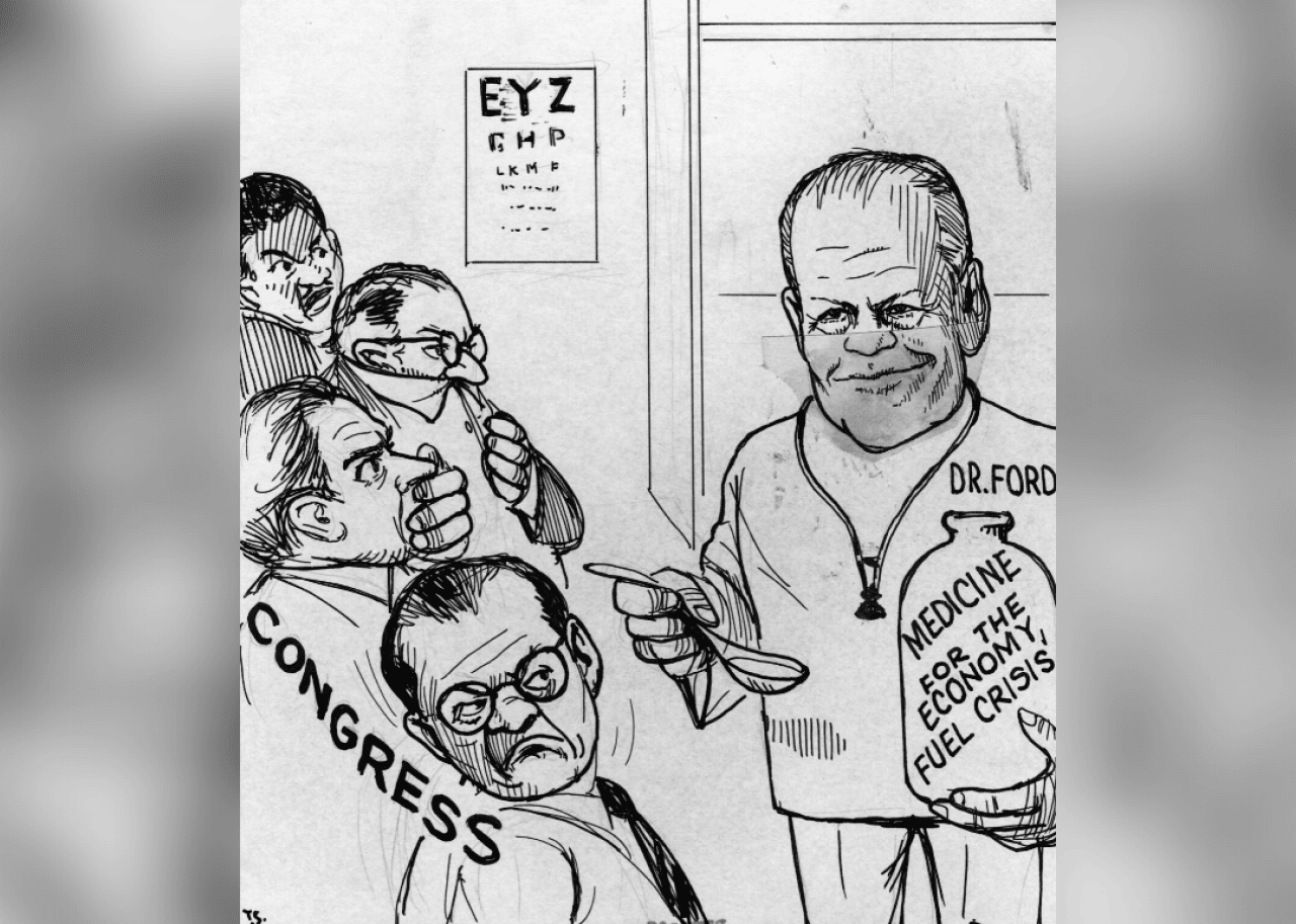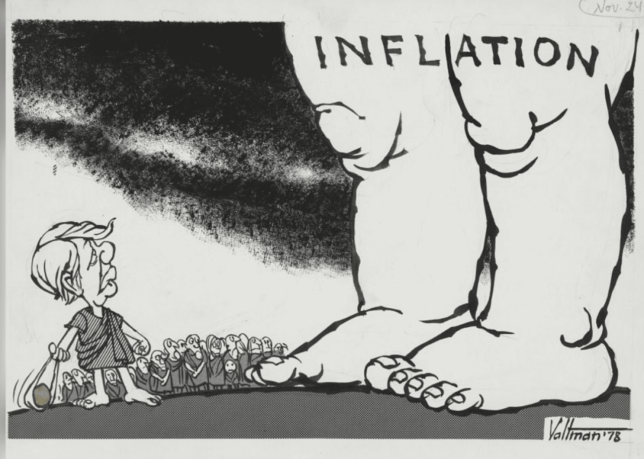 Edmund Valtman uses biblical figures in this drawing of President Jimmy Carter as David and inflation as Goliath. As president, Carter faced an intense period of “stagflation,” or stunted economic growth and very high inflation.