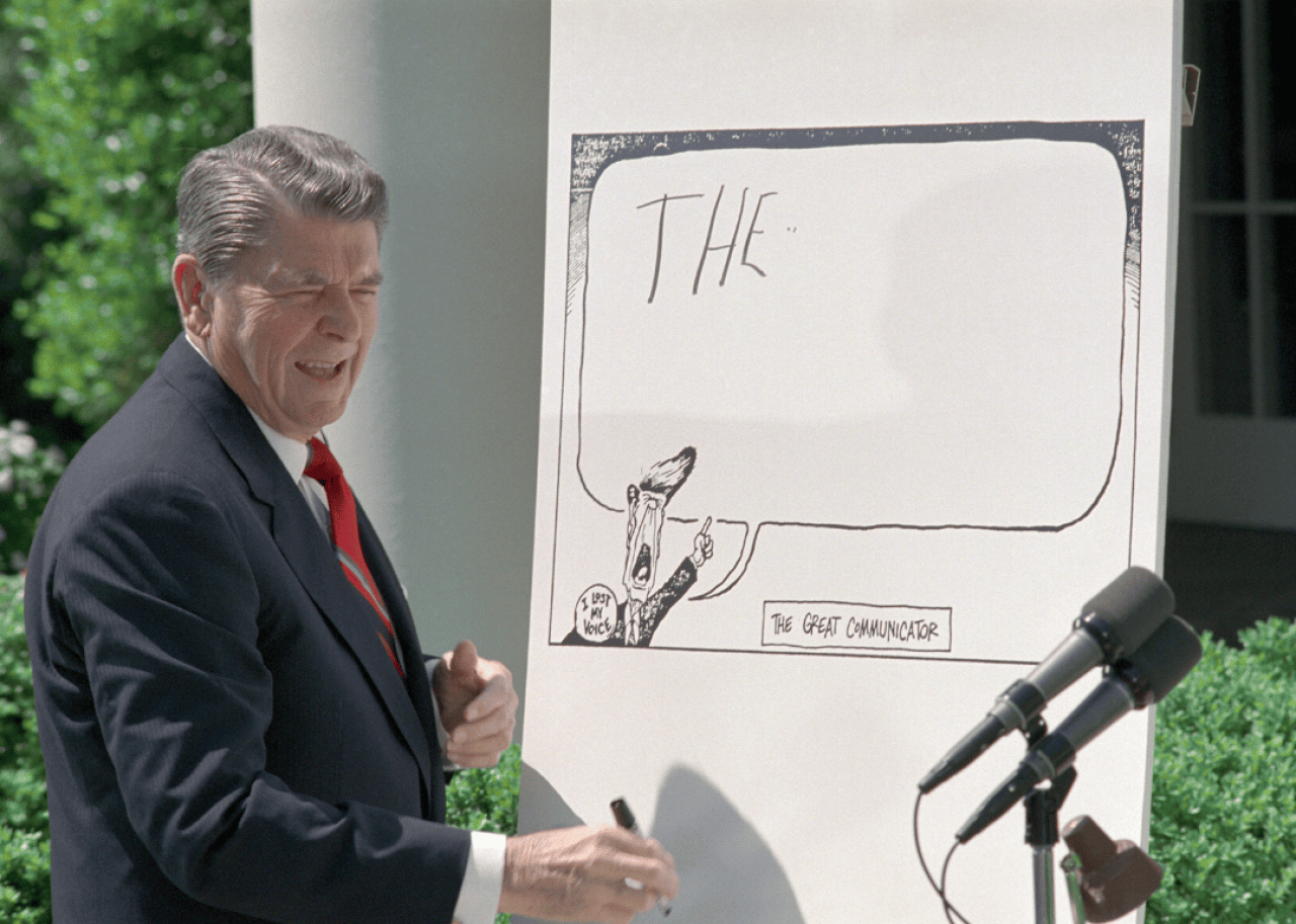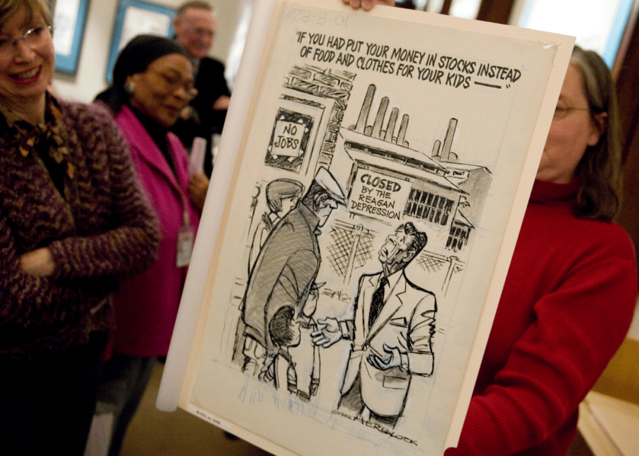 The picture shows President Ronald Reagan referring to a cartoon of himself. He had asked cartoonists to “take it easy” on him—a jab amidst the president’s regularly being featured in political cartoons.