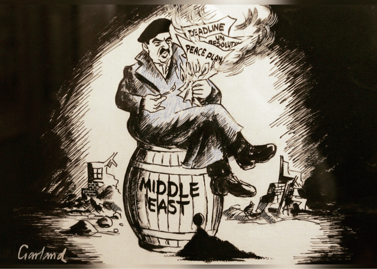Cartoonist Nicholas Garland recalls when former Iraqi leader Saddam Hussein invaded Kuwait despite threats from the United Nations Security Council. The cartoon shows Hussein sitting on an oil barrel representing the Middle East, while burning the security council resolution and a peace plan.