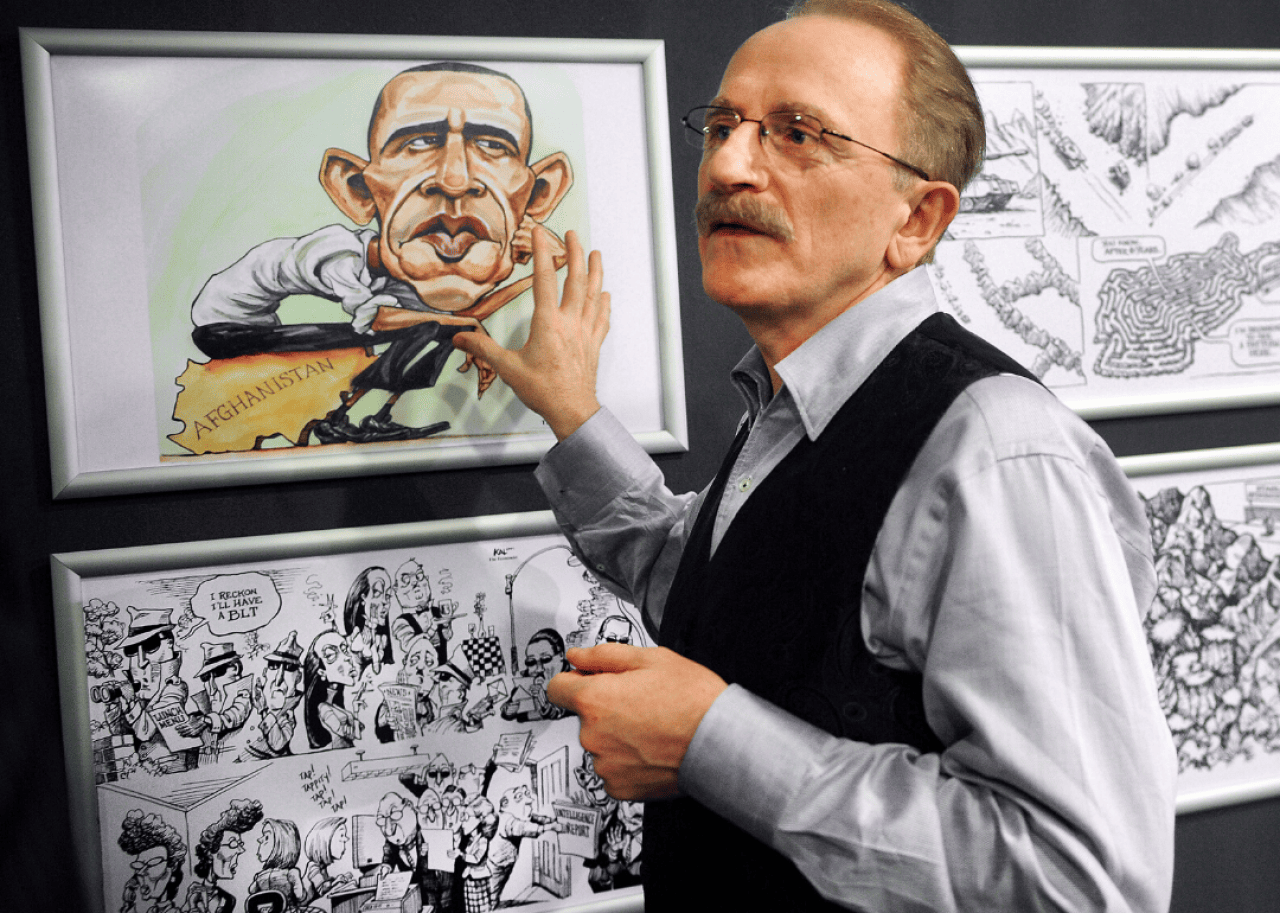In this photo, cartoonist Kevin Kallaugher stands next to his caricature of a pensive Barack Obama sitting on a wall that reads “Afghanistan.” The photo was taken at the National Museum of Contemporary Art in Bucharest, Romania. Kallaugher alluded to the dangers faced by political cartoonists.
