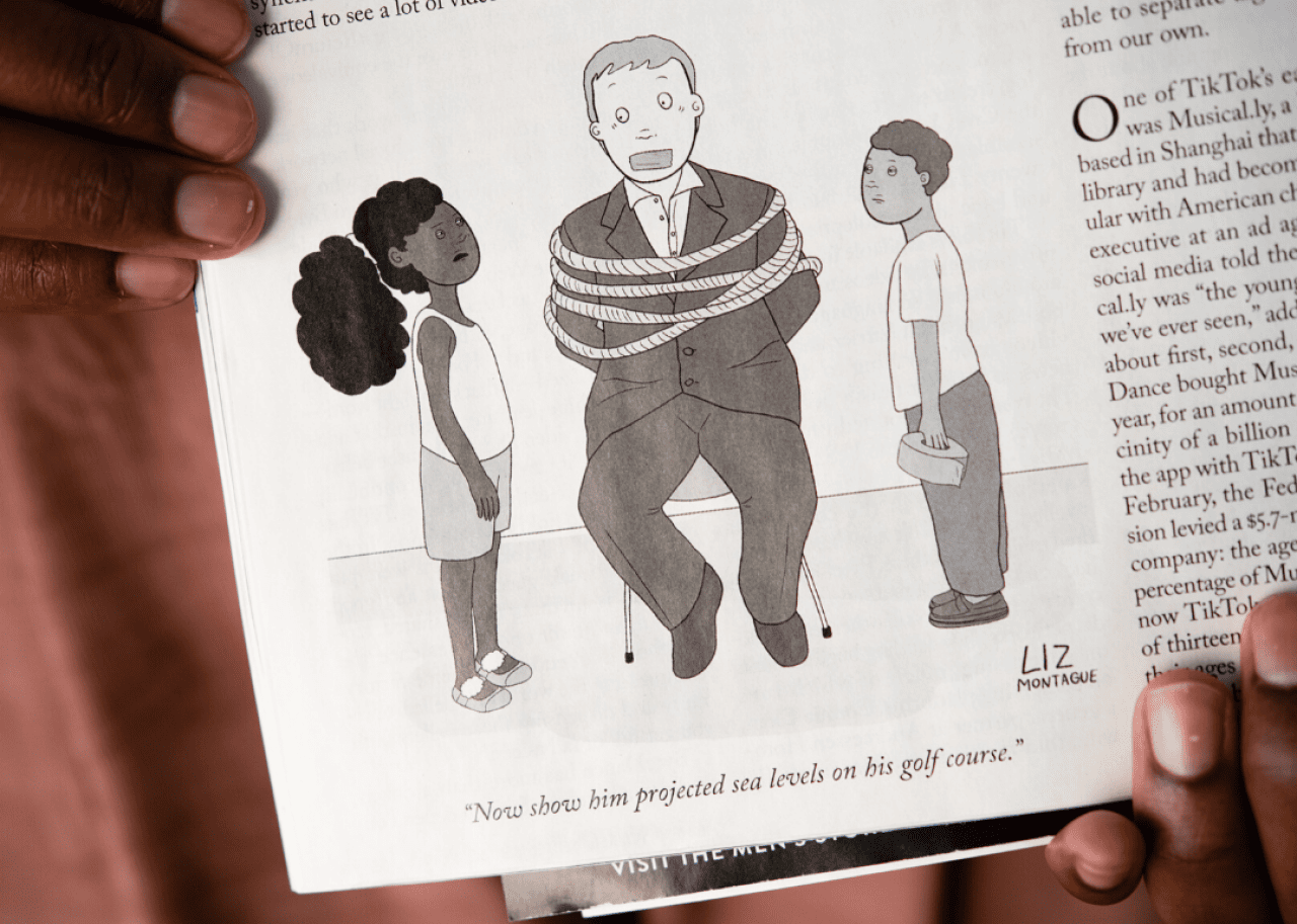 Cartoonist Elizabeth Montague is photographed at her apartment in January 2020. Her work has appeared in numerous publications. In this photo, she holds a cartoon that appeared in the New Yorker depicting children warning a restrained businessman of the hazards of climate change.