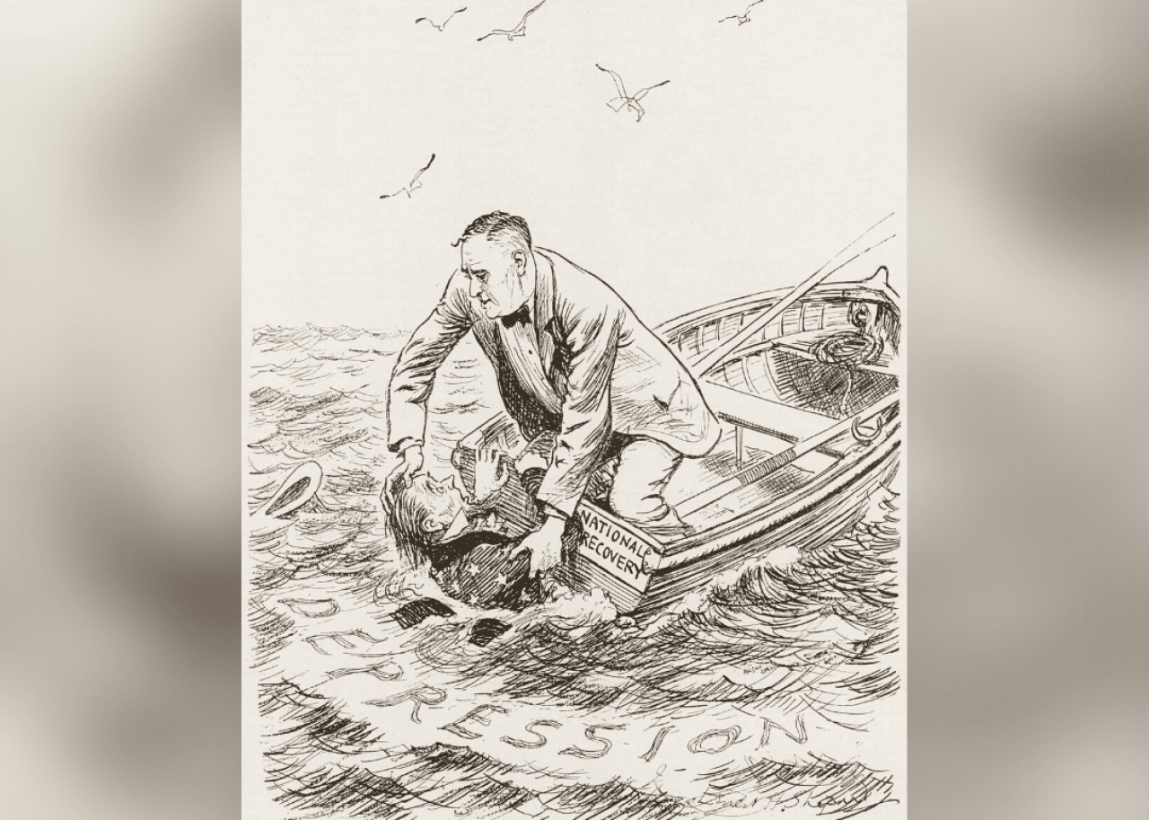 “The Illegal Act” shows Uncle Sam drowning in the Great Depression while President Franklin Roosevelt tries to save him from the “National Recovery.” The National Recovery Administration was FDR’s response to the Great Depression, later deemed by the Supreme Court to be unconstitutional.