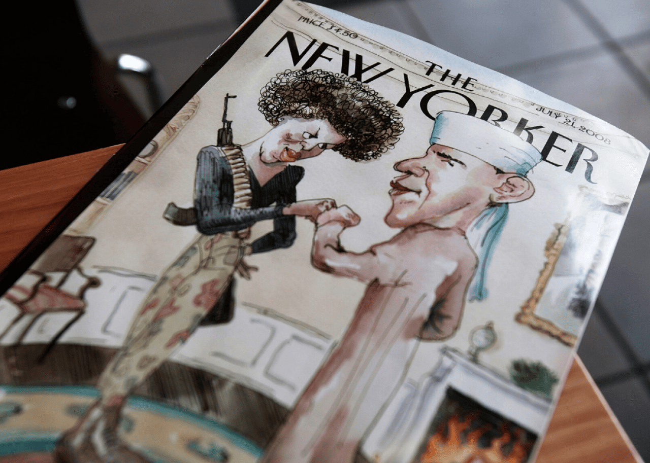 In this controversial cartoon, Barry Blitt drew Barack and Michelle Obama fist-bumping in the Oval Office. The president is dressed in an Arab outfit, while the First Lady carries a machine gun. Drawing criticism at the time, the New Yorker defended its cartoon, saying “satire doesn’t come with subtitles.”