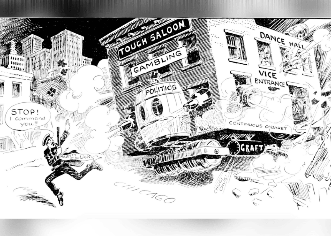 “Not All the Tanks Are in Europe” shows how a law enforcer is alone in fighting crime and corruption, symbolized by an army tank on the streets of Chicago. At the time, it was common practice for politicians to be in alliance with criminals in Chicago. At times, these politicians protected Chicago’s mob bosses and outlaws.