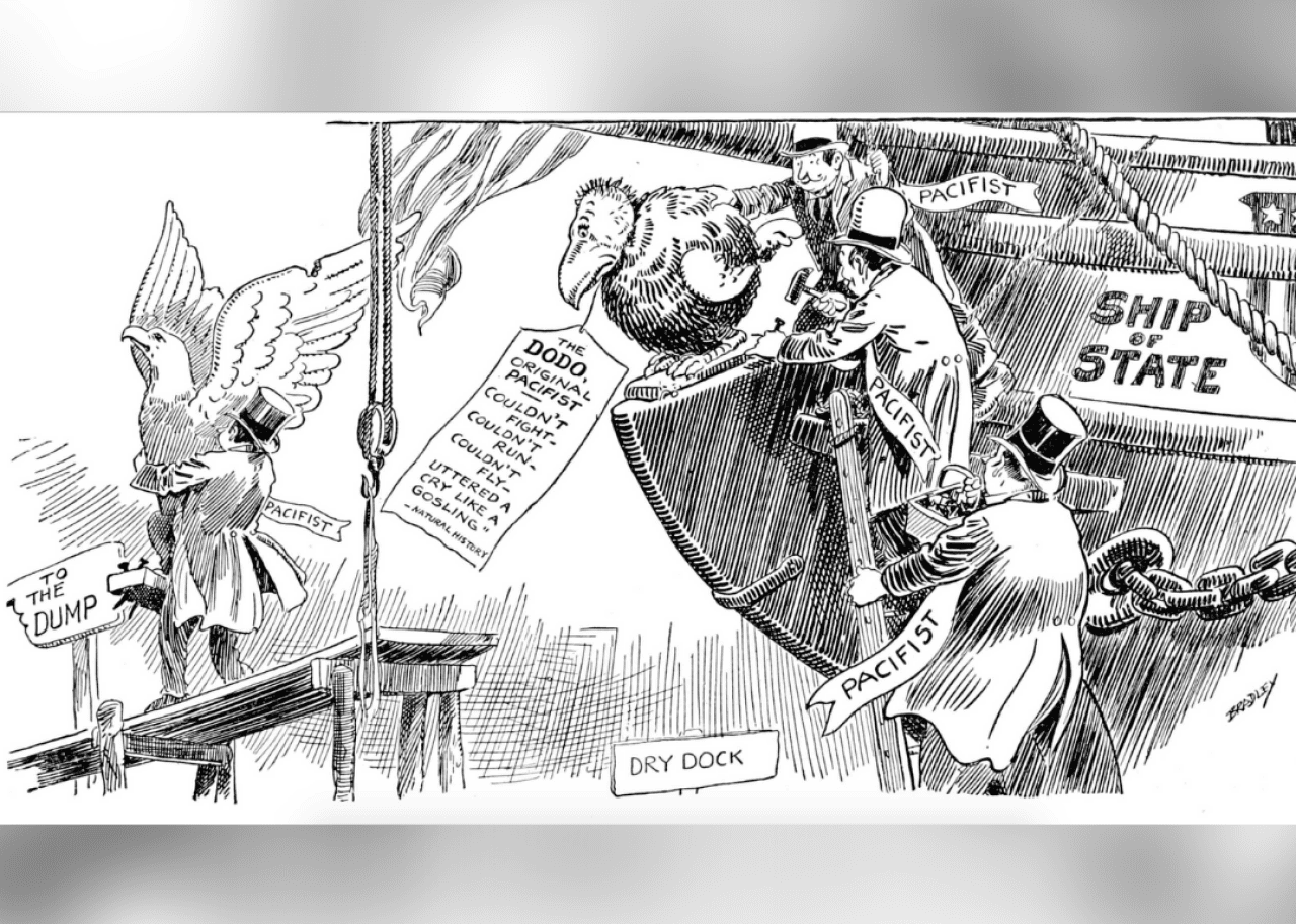 In “Perhaps They Would Like It for a Figurehead,” Luther Daniels Bradley mocks America’s lack of action in World War I by replacing the famous American eagle. Three pacifists can be seen in the cartoon removing the eagle with a sign that says “The Dodo Doesn’t Work.”