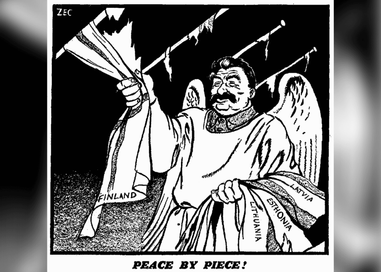 “Peace by Piece!” depicts Soviet leader Joseph Stalin with angel wings. He can be seen tearing down the flags of neighboring states including Finland, Estonia, Latvia, and Lithuania one by one while smiling heartily. The cartoon was set in a time Soviet leaders promised peace with neighboring countries. This was called into question when leaders modified these objectives under the guise of stopping the spread of war, and their own military intentions became more apparent.