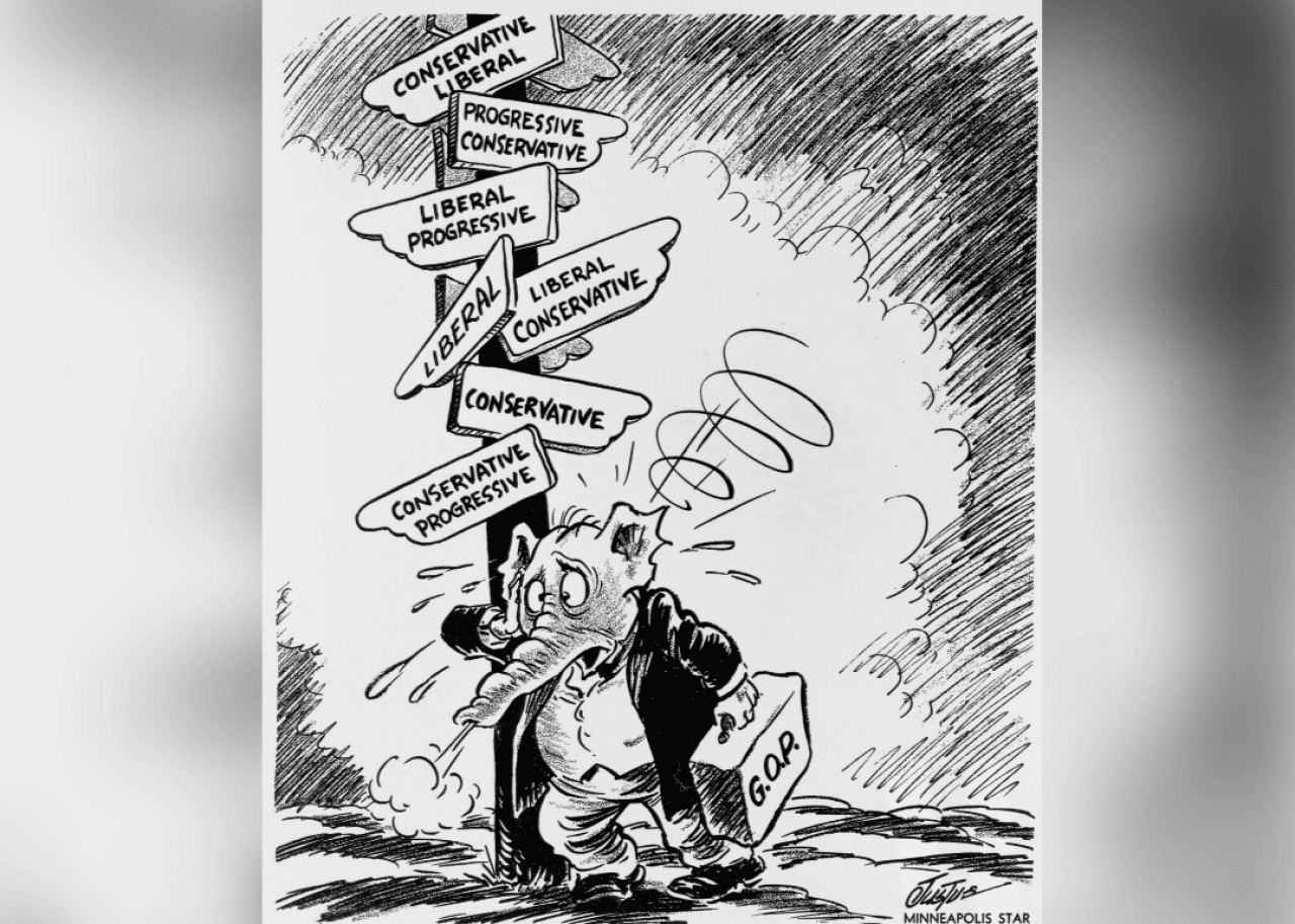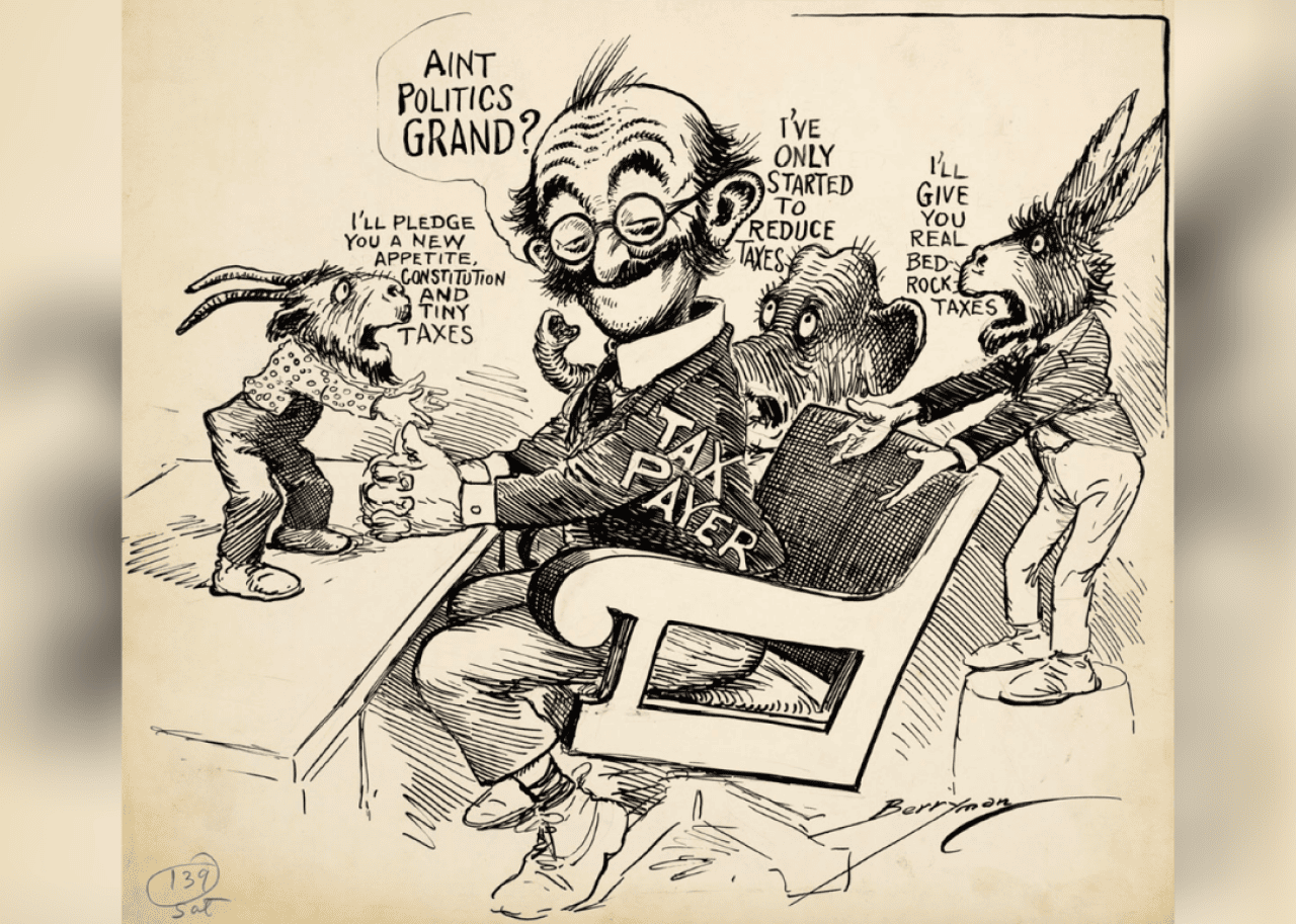 “Ain’t Politics Grand?” depicts the fight Democrats, the GOP, and Progressives were having in 1924. The cartoon shows three animals representing three factions, while the taxpayer sits in the middle, marveling.
