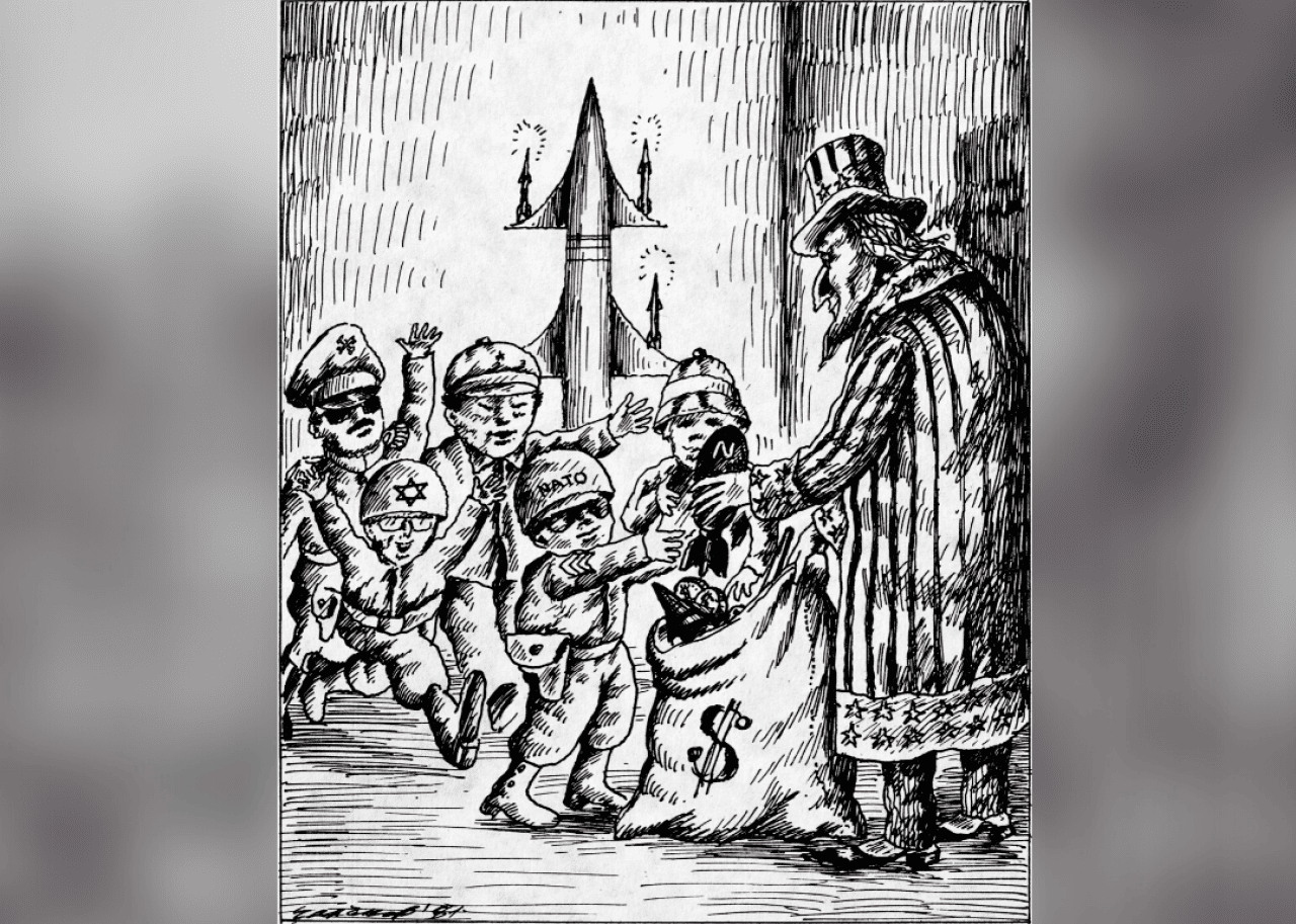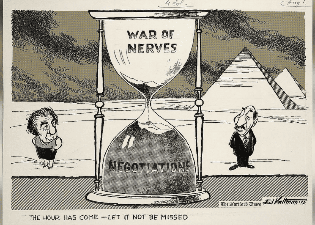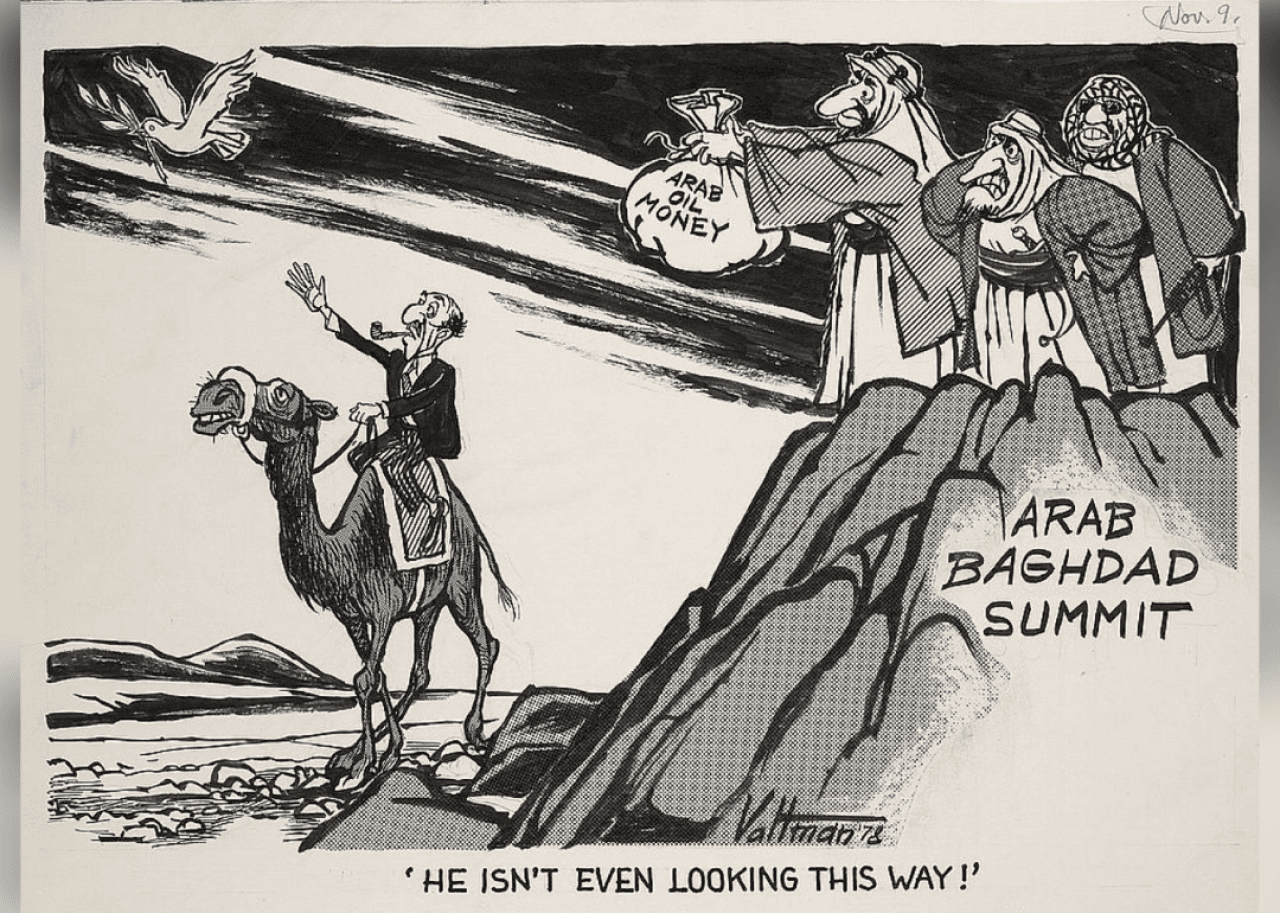 Valtman depicted Egyptian President Anwar Sadat atop a camel heading towards a dove with an olive branch in its beak, ignoring Arab oil money being offered to him. Sadat chose to sign a peace treaty with Israeli Prime Minister Menachem Begin instead.