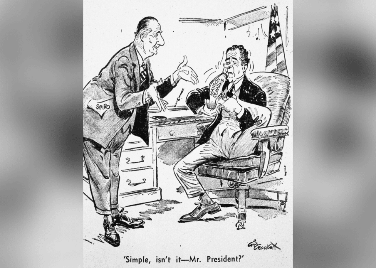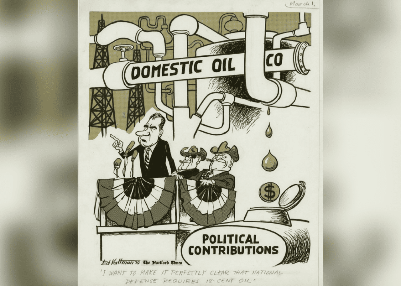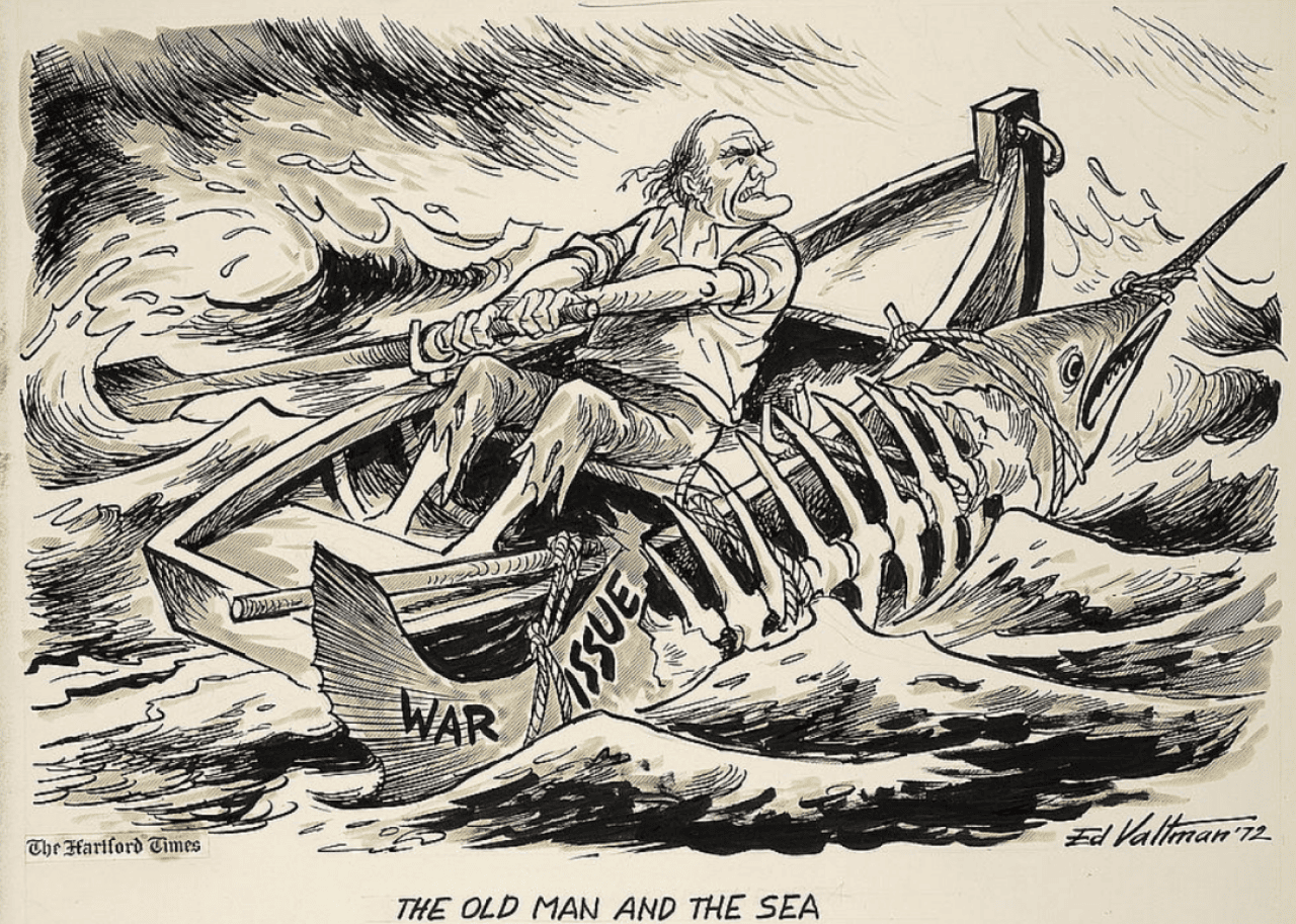 Valtman depicted Egyptian President Anwar Sadat atop a camel heading towards a dove with an olive branch in its beak, ignoring Arab oil money being offered to him. Sadat chose to sign a peace treaty with Israeli Prime Minister Menachem Begin instead.