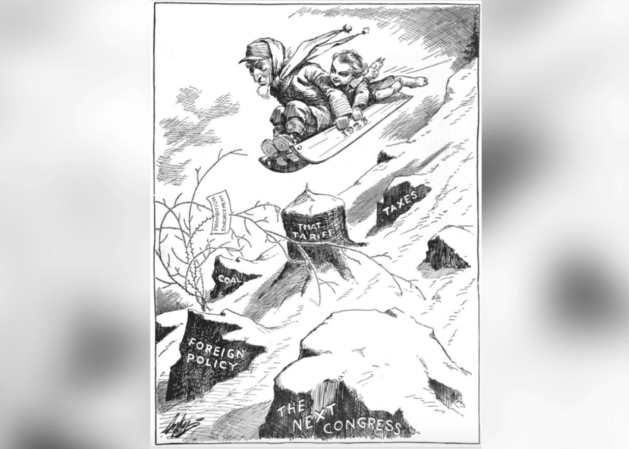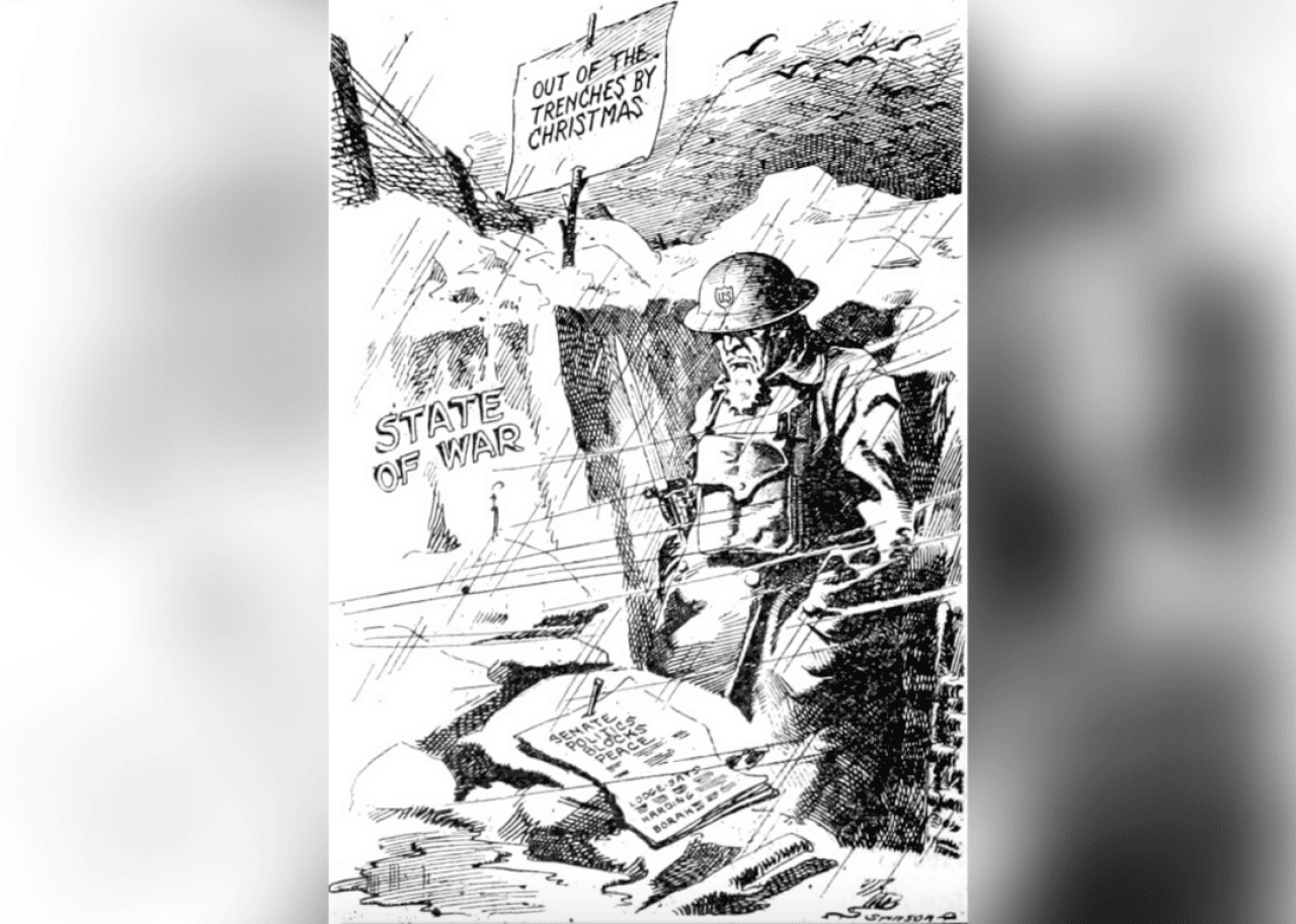 When World War I began in 1914, it was common to say it would be over by Christmas. Homer Stinson’s 1920 cartoon mocks that sentiment: his illustration came three years after the end of the war, following the Senate’s refusal to ratify the Treaty of Versailles. President Harding brought home U.S. troops stationed in Germany in 1923.