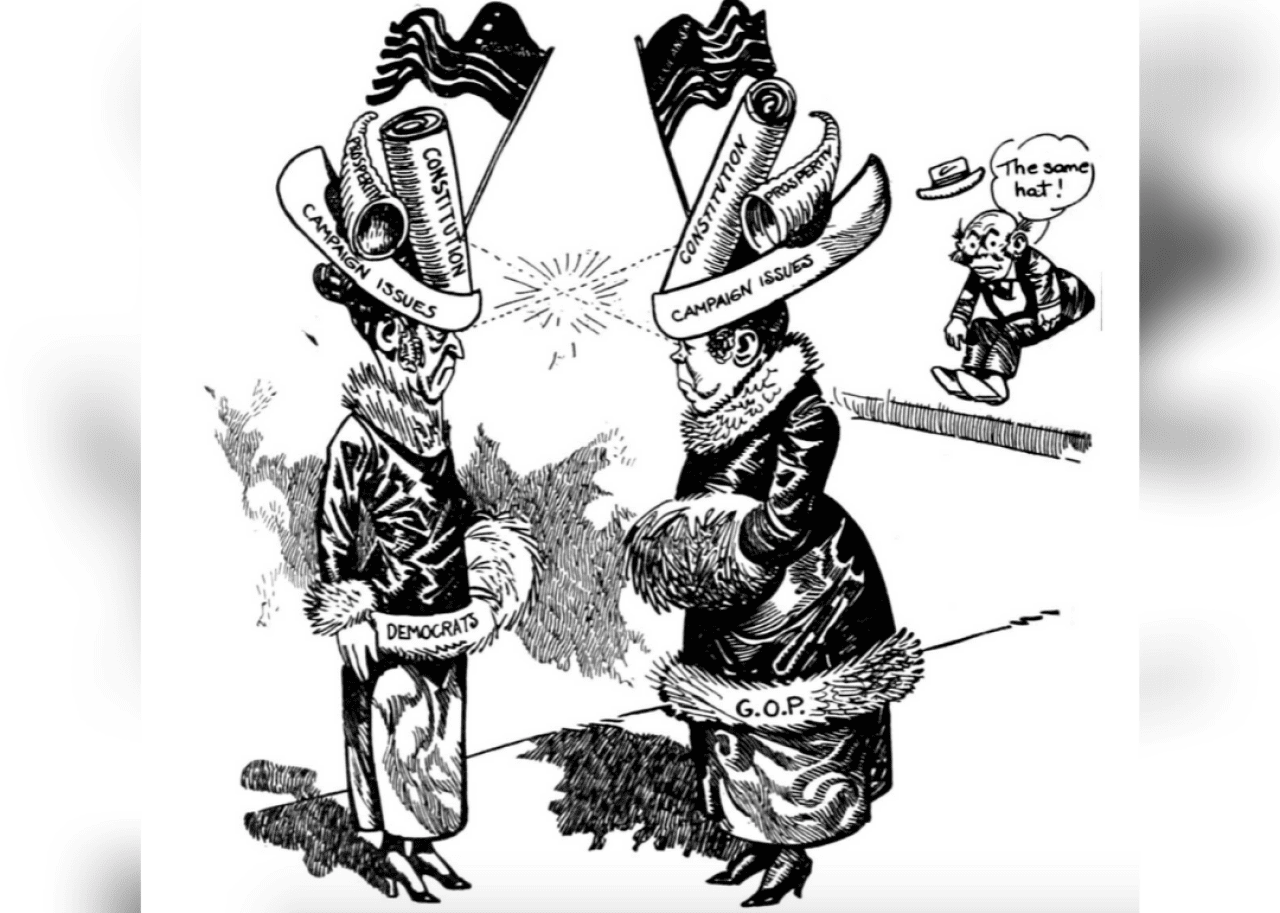 Burt Thomas drew the GOP and the Democrats wearing matching hats and toting the same issues, with a citizen watching on. The cartoon mocks the striking similarities between the two parties.