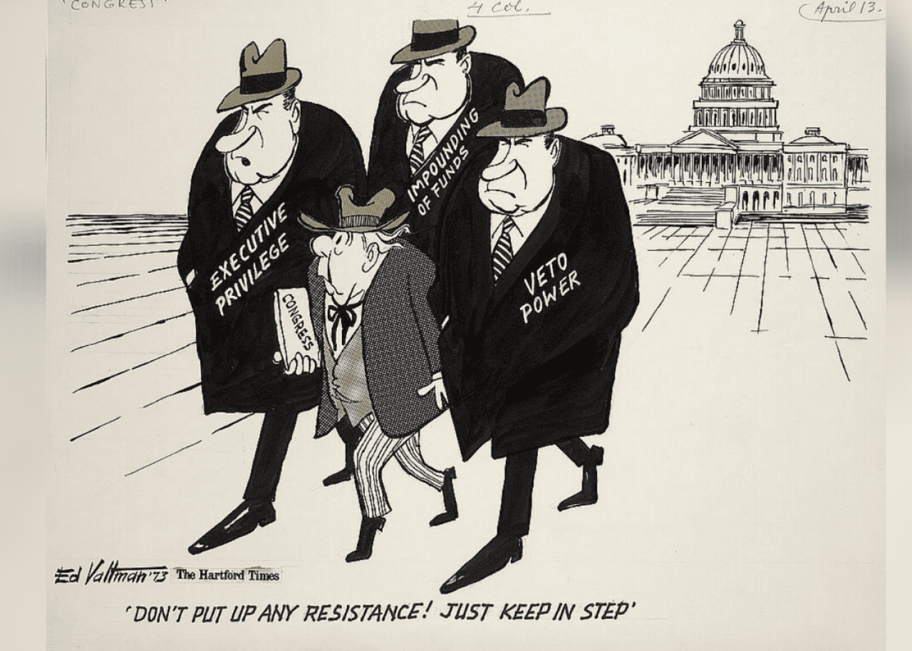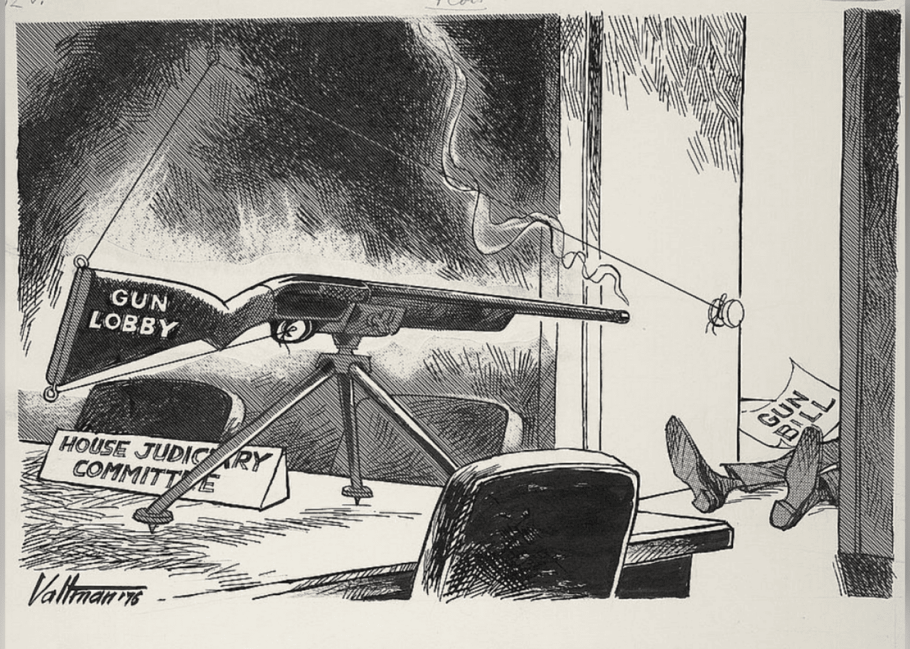 This cartoon by Edmund Valtman illustrates how the gun lobby suppressed a bill that would have banned concealed arms. It shows a rifle on the House Judiciary Committee’s desk, in a clear challenge to the weapons industry.