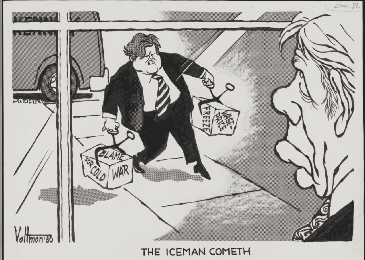 Valtman depicts Sen. Ted Kennedy as a madman with two ice blocks representing what he alleged President Jimmy Carter failed at, while Carter watches Kennedy struggle.