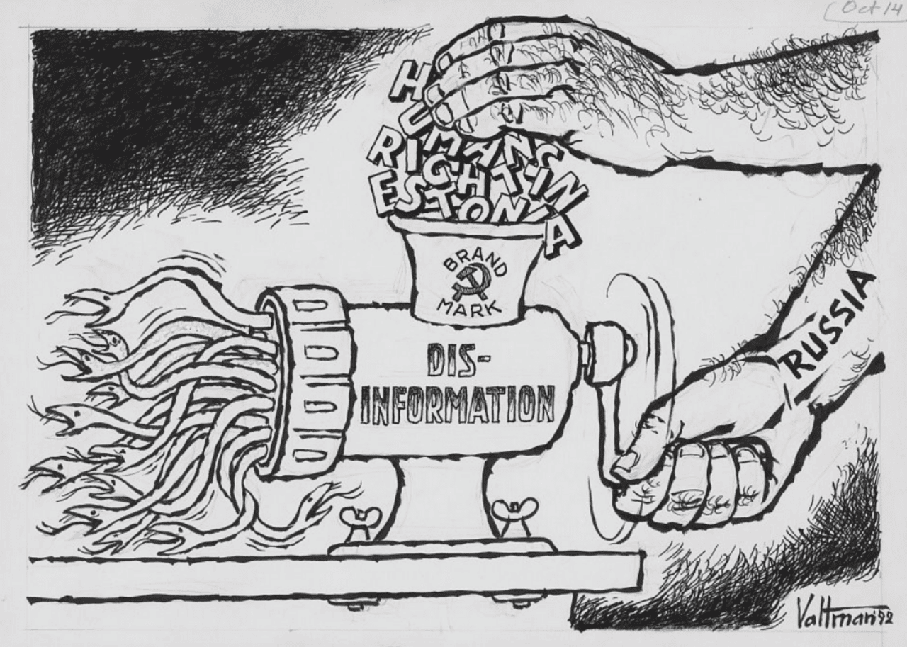“Disinformation” suggests that Russia is feeding Estonia’s human rights into a grinder with snakes coming out of the other side. The grinder itself features the hammer and sickle of communism.