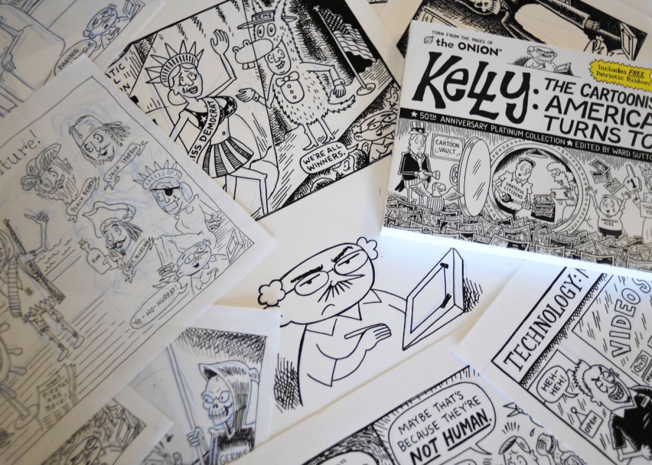 The image shows a selection of cartoons by Ward Sutton, the cartoonist for the satirical online publication, The Onion. Sutton’s sketches can be found under the alias “Kelly.”