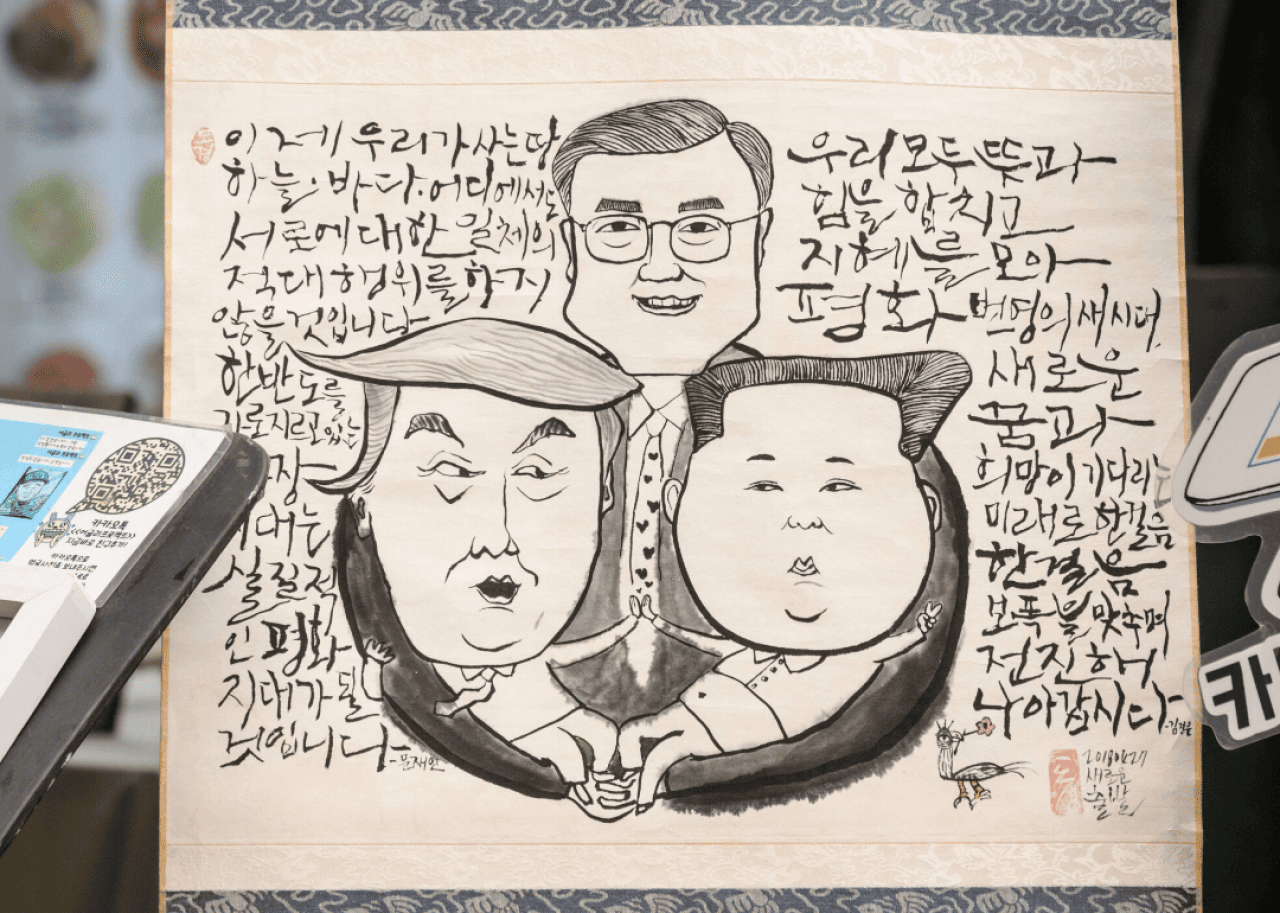 This sketch shows South Korean President Moon Jae-In embracing North Korean leader Kim Jong-Un, in reference to recent diplomacy developing between the three countries.