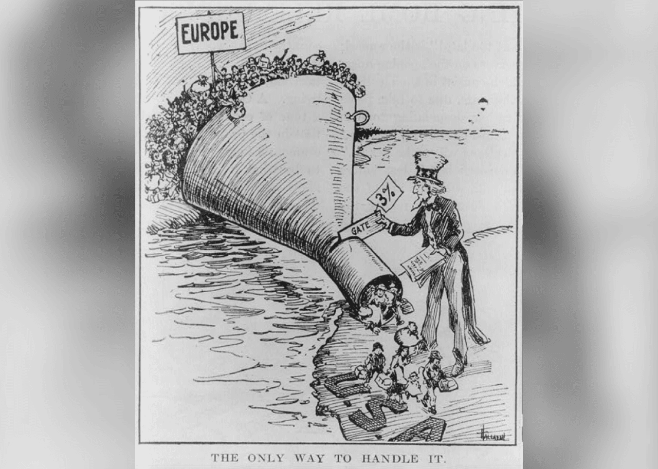 This cartoon shows America’s reluctance at the time to take in refugees. “The Only Way to Handle It” portrays Uncle Sam using a funnel to let in refugees, with an influx from the top.