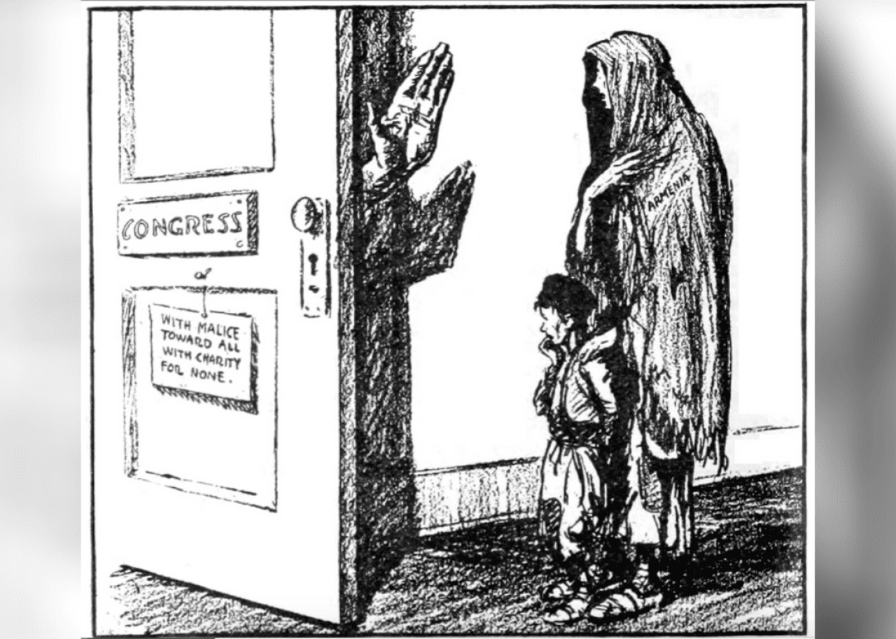 In “Go Away!” Rollin Kirby drew Congress from behind doors gesturing to Armenia with a sign that says “With malice towards all, with charity towards none.” This cartoon represents America’s non-recognition of the Armenian Genocide.